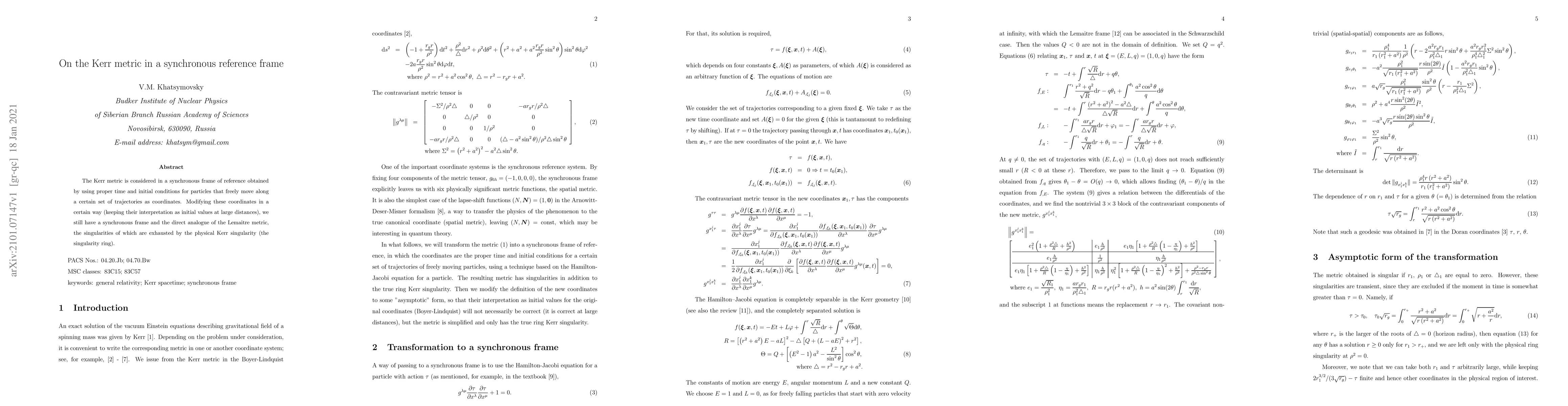 Researchers studied the Kerr metric in a synchronous reference frame, using modified coordinates that preserve the frame's properties while keeping their initial values at large distances. This approach allowed them to study the Kerr singularity in detail, similar to the Lemaitre metric.