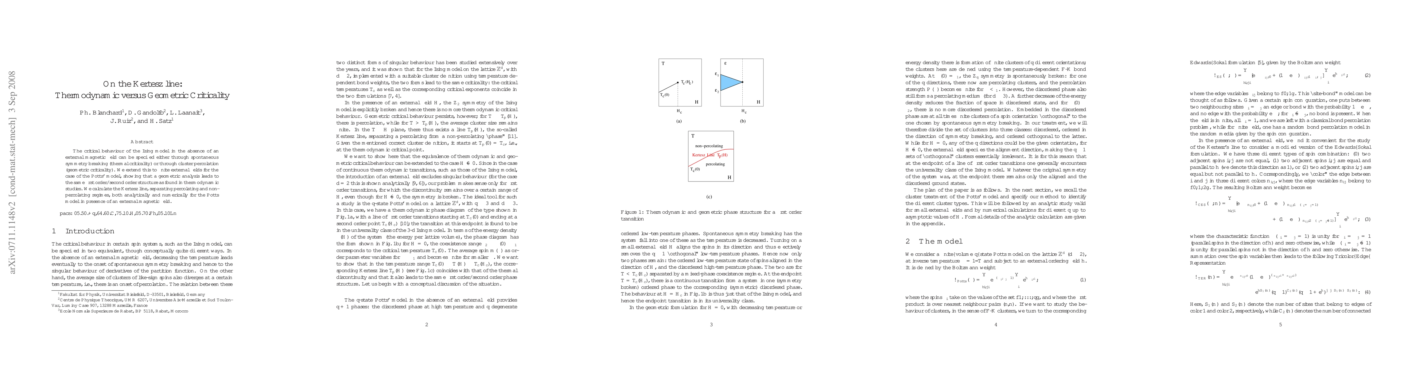 The critical behaviour of the Ising model in the absence of an external magnetic field can be specified either through spontaneous symmetry breaking (thermal criticality) or through cluster percolation (geometric criticality). We extend this to finite external fields for the case of the Potts' model, showing that a geometric analysis leads to the same first order/second order structure as found in thermodynamic studies. We calculate the Kert\'esz line, separating percolating and non-percolating regimes, both analytically and numerically for the Potts model in presence of an external magnetic field.
