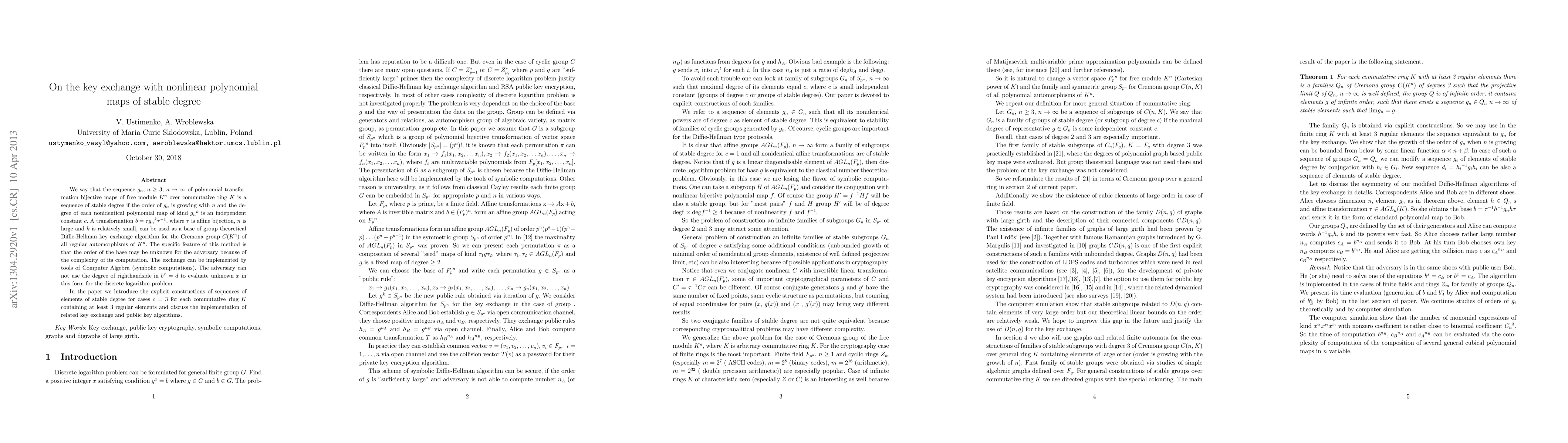 We say that the sequence $g_n$, $n\ge 3$, $n \rightarrow \infty$ of polynomial transformation bijective maps of free module $K^n$ over commutative ring $K$ is a sequence of stable degree if the order of $g_n$ is growing with $n$ and the degree of each nonidentical polynomial map of kind ${g_n}^k$ is an independent constant $c$. A transformation $b={\tau} {g_n}^k {\tau}^{-1}$, where $\tau$ is affine bijection, $n$ is large and $k$ is relatively small, can be used as a base of group theoretical Diffie-Hellman key exchange algorithm for the Cremona group $C(K^n)$ of all regular automorphisms of $K^n$. The specific feature of this method is that the order of the base may be unknown for the adversary because of the complexity of its computation. The exchange can be implemented by tools of Computer Algebra (symbolic computations). The adversary can not use the degree of righthandside in $b^x=d$ to evaluate unknown $x$ in this form for the discrete logarithm problem. In the paper we introduce the explicit constructions of sequences of elements of stable degree for cases $c=3$ for each commutative ring $K$ containing at least 3 regular elements and discuss the implementation of related key exchange and public key algorithms.