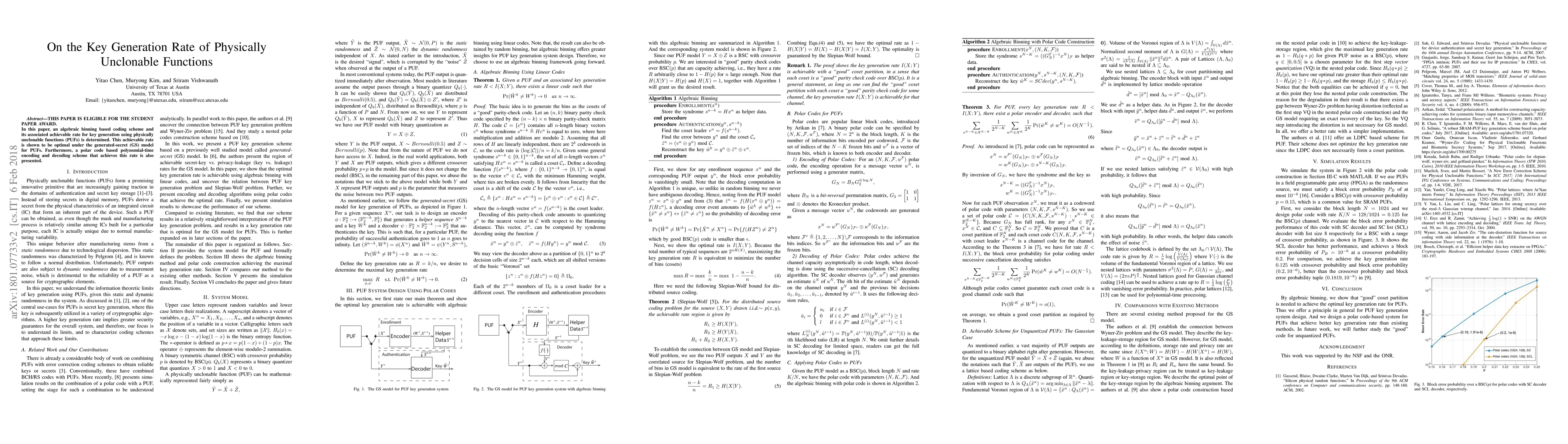In this paper, an algebraic binning based coding scheme and its associated achievable rate for key generation using physically unclonable functions (PUFs) is determined. This achievable rate is shown to be optimal under the generated-secret (GS) model for PUFs. Furthermore, a polar code based polynomial-time encoding and decoding scheme that achieves this rate is also presented.