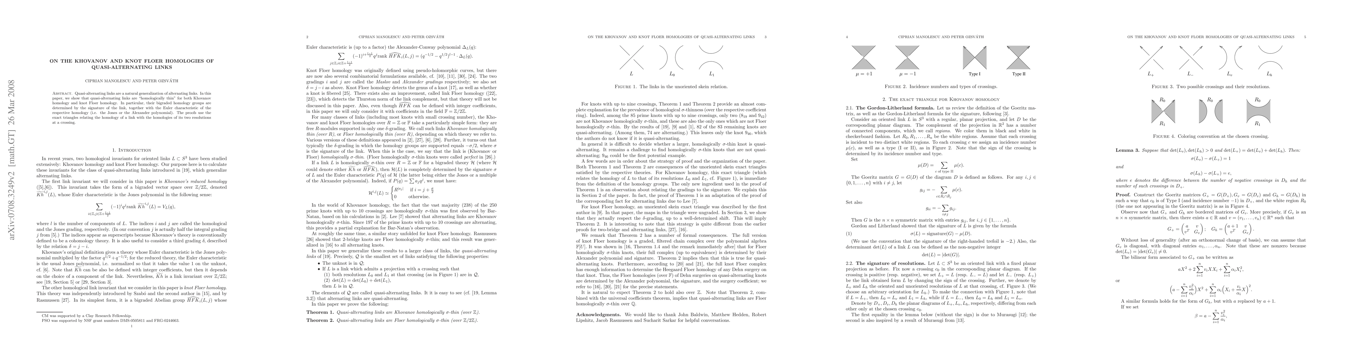 This paper demonstrates that quasi-alternating links exhibit "homologically thin" properties in both Khovanov and knot Floer homologies, with their bigraded homology groups determined by the link's signature and Euler characteristic. The proofs rely on exact triangles linking the homology of a link to its resolutions at a crossing.
