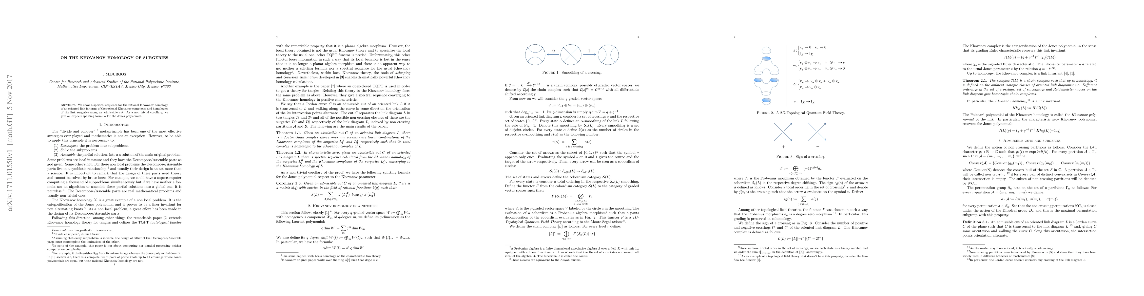 This paper develops a spectral sequence relating the Khovanov homology of an oriented link to that of its surgeries along an admissible cut, leading to an explicit splitting formula for the Jones polynomial.