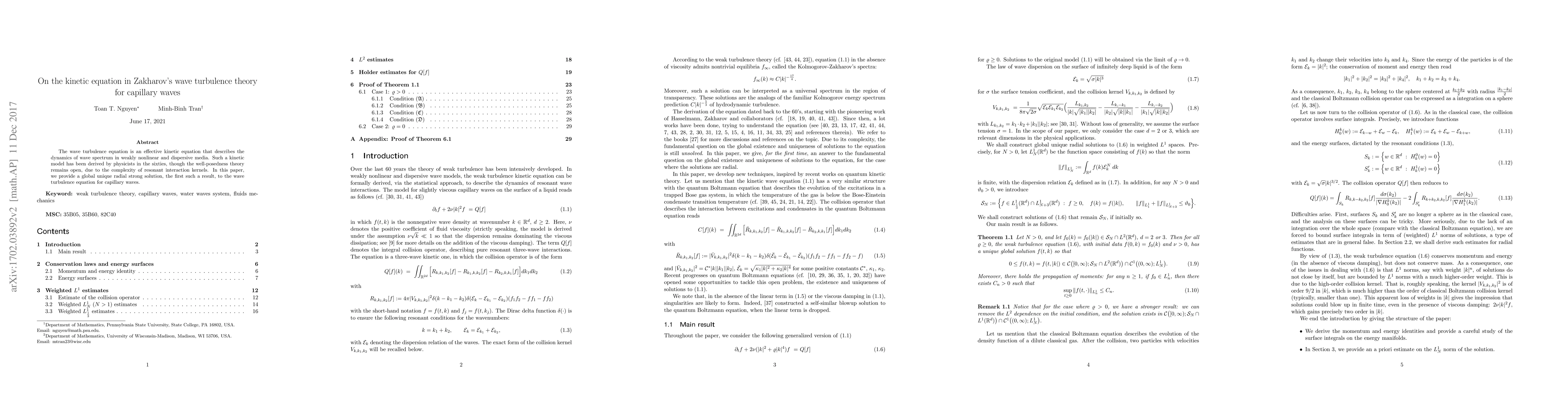 This paper presents the first global unique radial strong solution to the wave turbulence equation for capillary waves, addressing the longstanding open problem of well-posedness in the kinetic model describing weakly nonlinear and dispersive media dynamics.