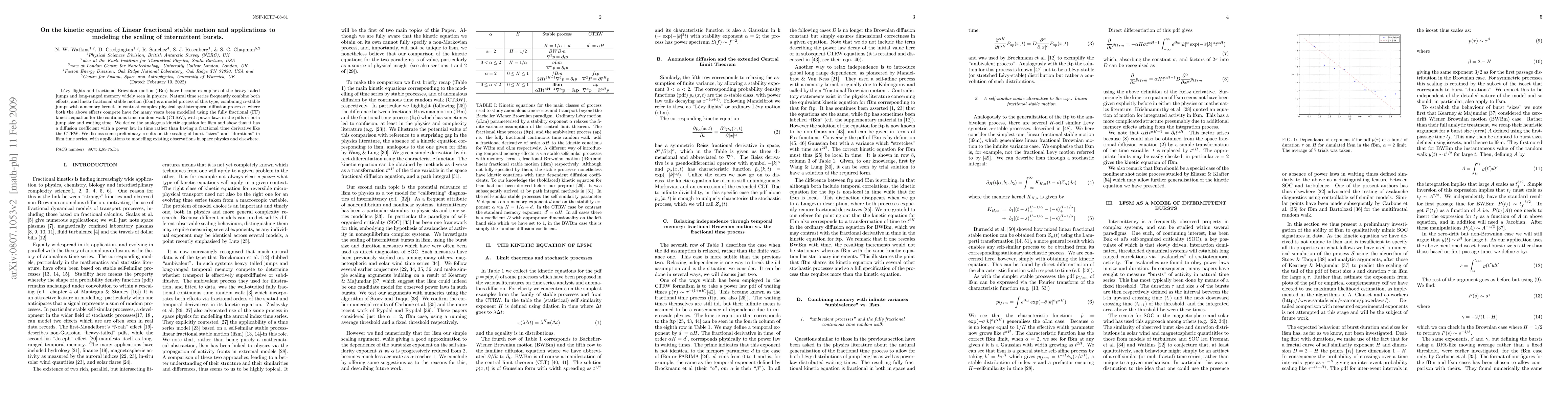 This paper derives the kinetic equation for linear fractional stable motion (lfsm), combining alpha-stable jumps and memory kernels, and contrasts it with the fractional kinetic equation for continuous time random walk (CTRW). It discusses the scaling of intermittent bursts in lfsm and applies the model to observations in space physics.