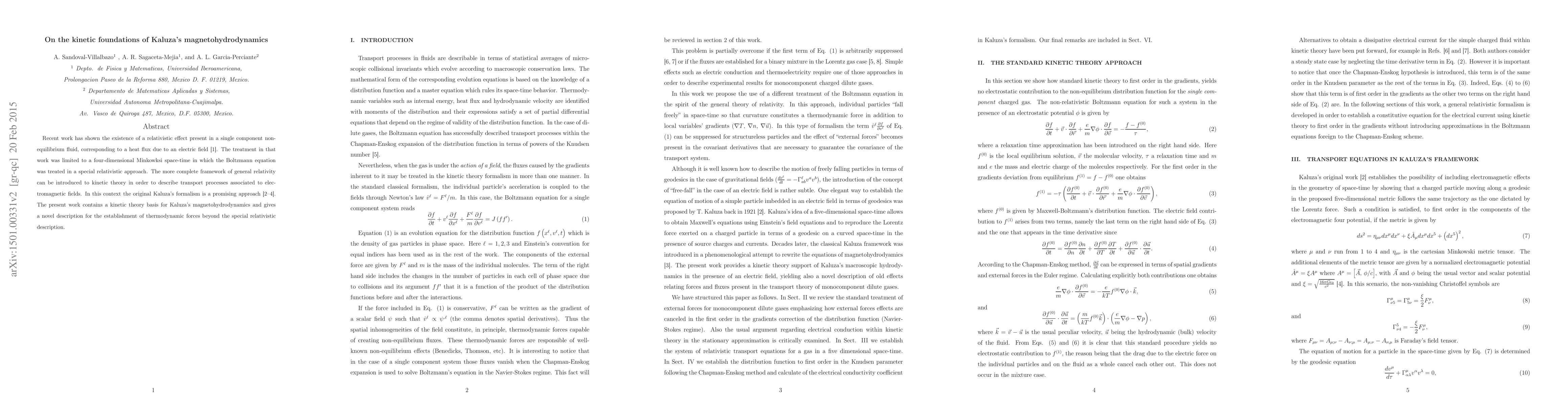 Recent work has shown the existence of a relativistic effect present in a single component non-equilibrium fluid, corresponding to a heat flux due to an electric field. The treatment in that work was limited to a four-dimensional Minkowksi space-time in which the Boltzmann equation was treated in a special relativistic approach. The more complete framework of general relativity can be introduced to kinetic theory in order to describe transport processes associated to electromagnetic fields. In this context the original Kaluza's formalism is a promising approach. The present work contains a kinetic theory basis for Kaluza's magnetohydrodynamics and gives a novel description for the establishment of thermodynamic forces beyond the special relativistic description.