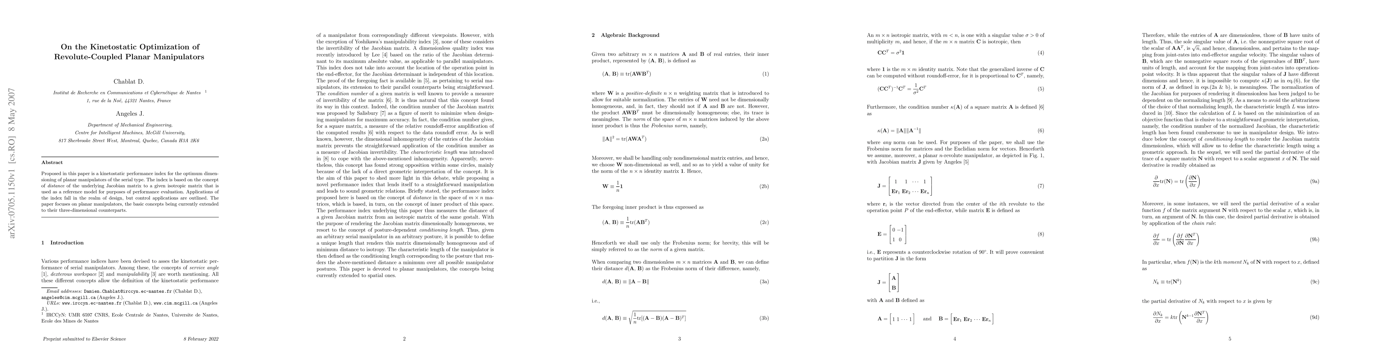 This paper proposes a kinetostatic performance index for optimizing the dimensions of planar serial manipulators, based on the distance of the Jacobian matrix to an isotropic reference model. The index is applicable in design and control applications, with concepts being extended to three-dimensional manipulators.