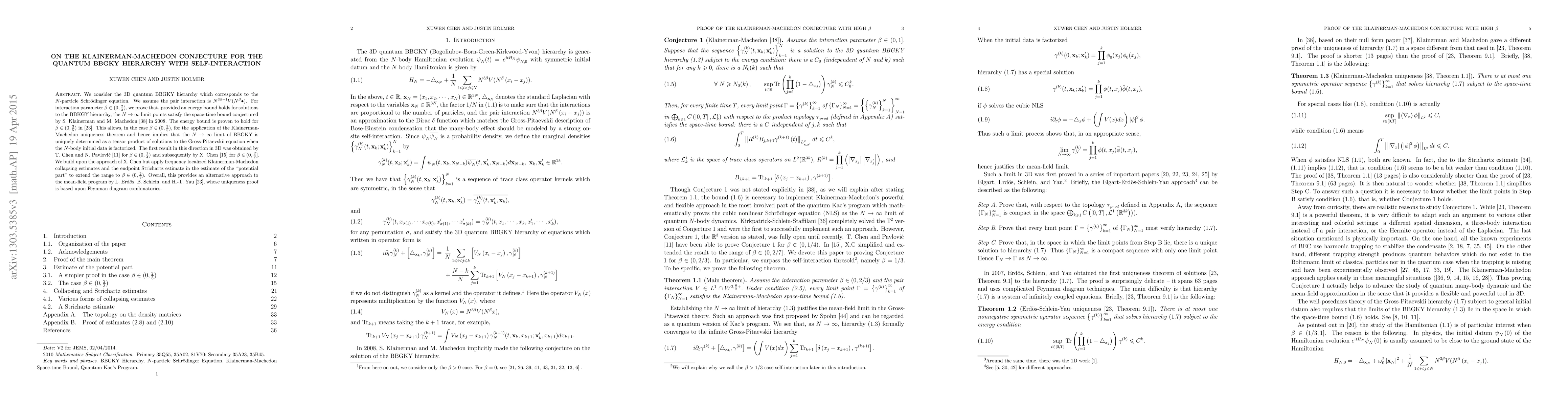 We consider the 3D quantum BBGKY hierarchy which corresponds to the $N$-particle Schr\"{o}dinger equation. We assume the pair interaction is $N^{3\beta -1}V(N^{\beta}\bullet).$ For interaction parameter $\beta \in(0,\frac23)$, we prove that, as $N\rightarrow \infty ,$ the limit points of the solutions to the BBGKY hierarchy satisfy the space-time bound conjectured by Klainerman-Machedon in 2008. This allows for the application of the Klainerman-Machedon uniqueness theorem, and hence implies that the limit is uniquely determined as a tensor product of solutions to the Gross-Pitaevski equation when the $N$-body initial data is factorized. The first result in this direction in 3D was obtained by T. Chen and N. Pavlovi\'{c} (2011) for $\beta \in (0,\frac14)$ and subsequently by X. Chen (2012) for $\beta\in (0,\frac27]$. We build upon the approach of X. Chen but apply frequency localized Klainerman-Machedon collapsing estimates and the endpoint Strichartz estimate in the estimate of the potential part to extend the range to $\beta\in (0,\frac23)$. Overall, this provides an alternative approach to the mean-field program by Erd\"os-Schlein-Yau (2007), whose uniqueness proof is based upon Feynman diagram combinatorics.