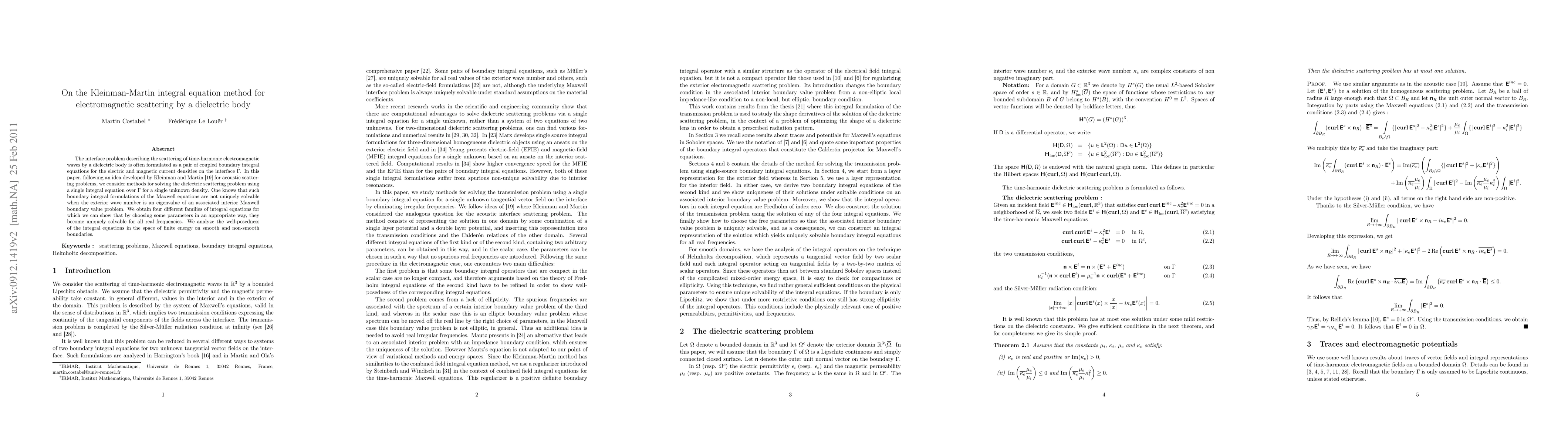 This paper explores the Kleinman-Martin integral equation method for solving electromagnetic scattering by a dielectric body, deriving four families of integral equations that become uniquely solvable for all frequencies by appropriately choosing parameters. The well-posedness of these integral equations is analyzed for both smooth and non-smooth boundaries.