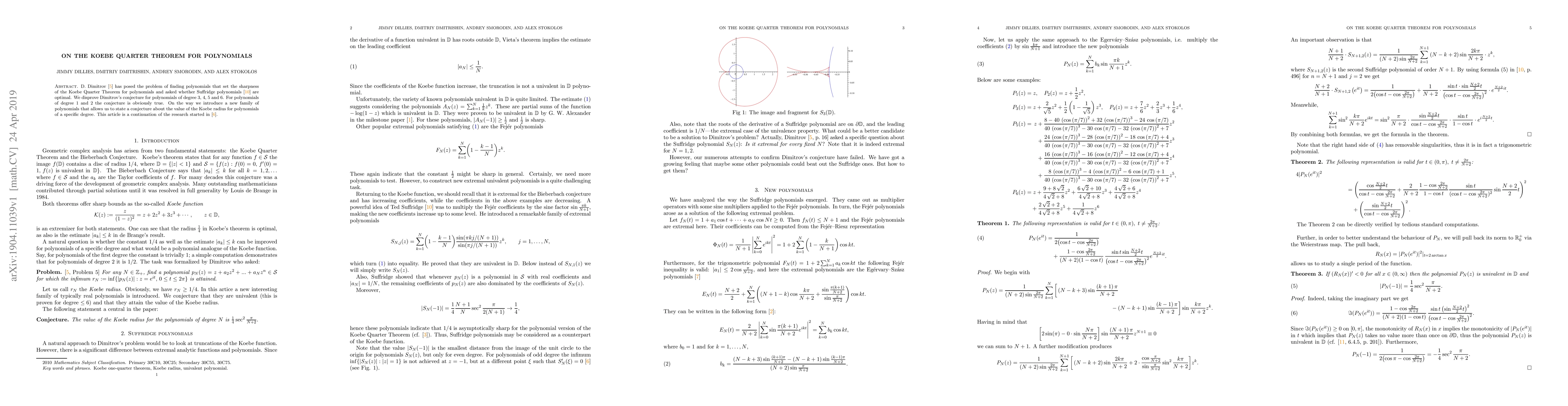 D. Dimitrov has posed the problem of finding polynomials that set the sharpness of the Koebe Quarter Theorem for polynomials and asked whether Suffridge polynomials are optimal. We disprove Dimitrov's conjecture for polynomials of degree 3, 4, 5 and 6. For polynomials of degree 1 and 2 the conjecture is obviously true. On the way we introduce a new family of polynomials that allows us to state a conjecture about the value of the Koebe radius for polynomials of a specific degree.