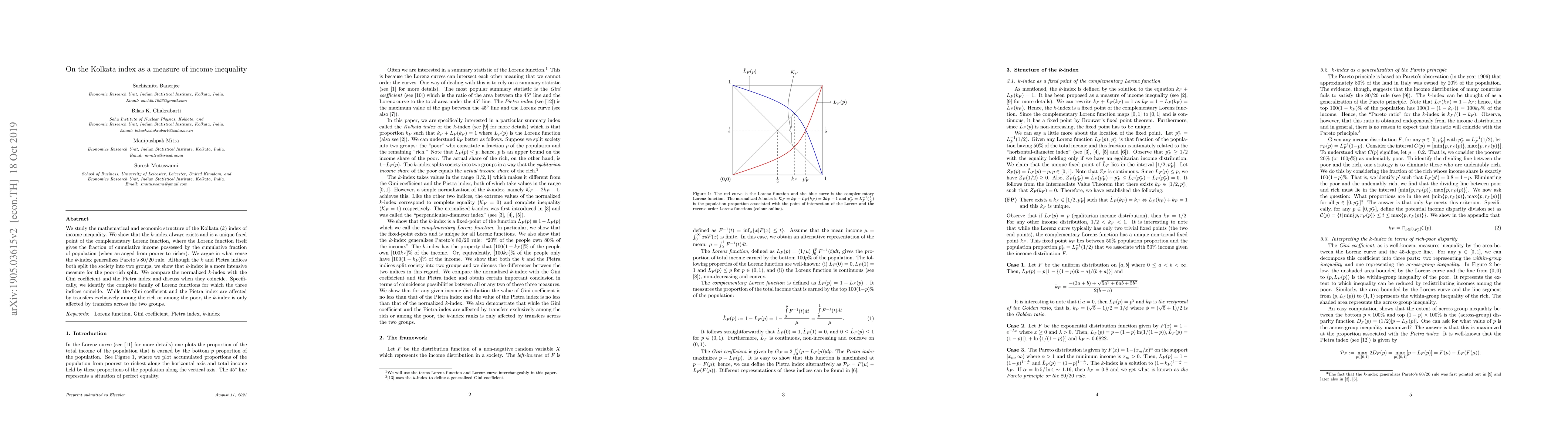 We study the mathematical and economic structure of the Kolkata (k) index of income inequality. We show that the k-index always exists and is a unique fixed point of the complementary Lorenz function, where the Lorenz function itself gives the fraction of cumulative income possessed by the cumulative fraction of population (when arranged from poorer to richer). We show that the k-index generalizes Pareto's 80/20 rule. Although the k and Pietra indices both split the society into two groups, we show that k-index is a more intensive measure for the poor-rich split. We compare the normalized k-index with the Gini coefficient and the Pietra index and discuss when they coincide. We establish that for any income distribution the value of Gini coefficient is no less than that of the Pietra index and the value of the Pietra index is no less than that of the normalized k-index. While the Gini coefficient and the Pietra index are affected by transfers exclusively among the rich or among the poor, the k-index is only affected by transfers across the two groups.