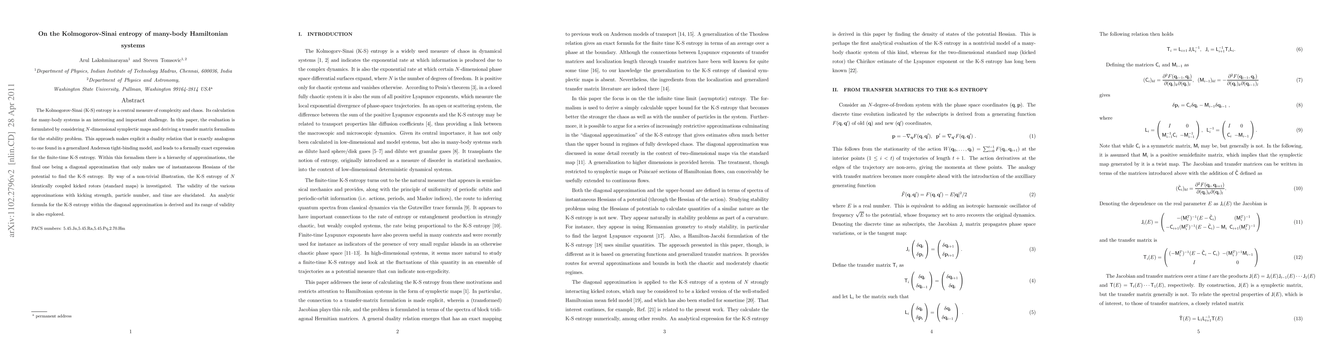 The Kolmogorov-Sinai (K-S) entropy is a central measure of complexity and chaos. Its calculation for many-body systems is an interesting and important challenge. In this paper, the evaluation is formulated by considering $N$-dimensional symplectic maps and deriving a transfer matrix formalism for the stability problem. This approach makes explicit a duality relation that is exactly analogous to one found in a generalized Anderson tight-binding model, and leads to a formally exact expression for the finite-time K-S entropy. Within this formalism there is a hierarchy of approximations, the final one being a diagonal approximation that only makes use of instantaneous Hessians of the potential to find the K-S entropy. By way of a non-trivial illustration, the K-S entropy of $N$ identically coupled kicked rotors (standard maps) is investigated. The validity of the various approximations with kicking strength, particle number, and time are elucidated. An analytic formula for the K-S entropy within the diagonal approximation is derived and its range of validity is also explored.