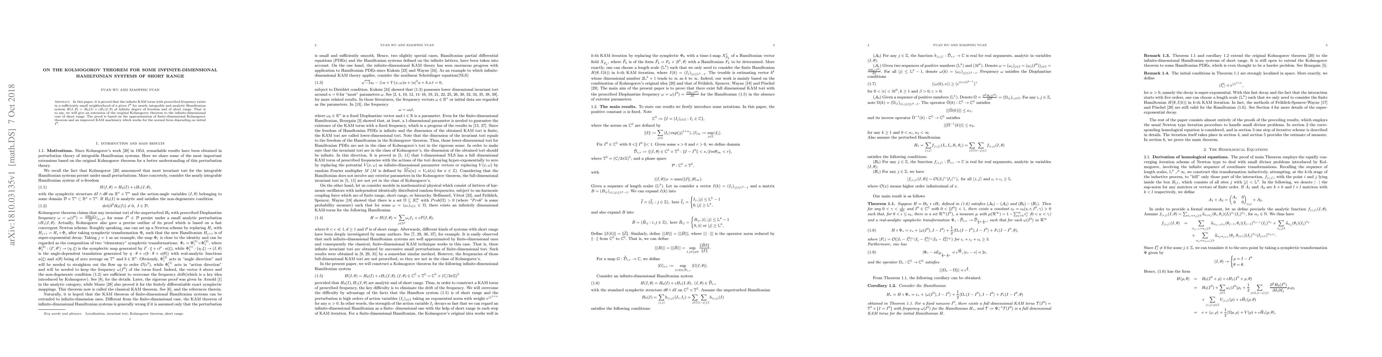 This paper extends the Kolmogorov theorem to infinite-dimensional, nearly integrable, and analytic Hamiltonian systems of short range, proving the existence of an infinite KAM torus in a small neighborhood of a given initial condition. The proof leverages finite-dimensional Kolmogorov theorem approximations and an enhanced KAM method tailored to the initial condition.
