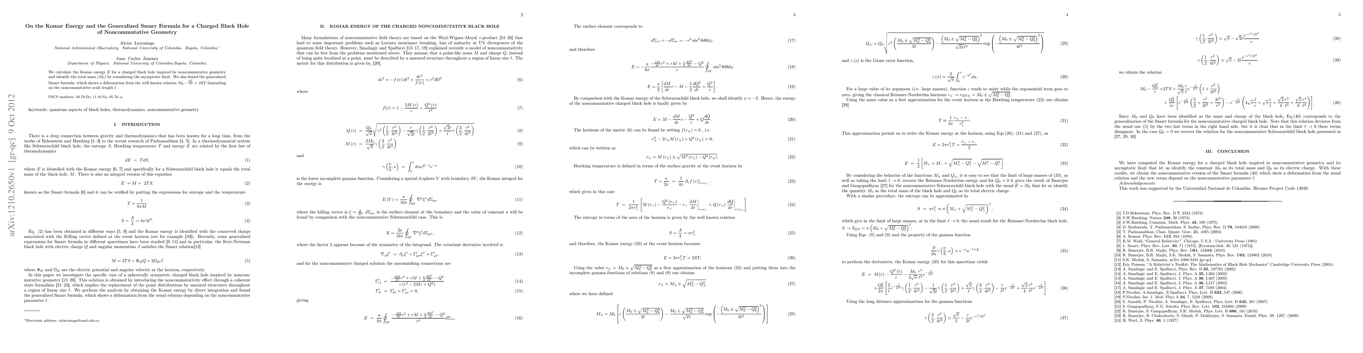 This paper calculates the Komar energy for a charged black hole influenced by noncommutative geometry and identifies its total mass via asymptotic limits. It also derives a generalized Smarr formula that deviates from the standard relation due to the noncommutative scale length $\ell$.