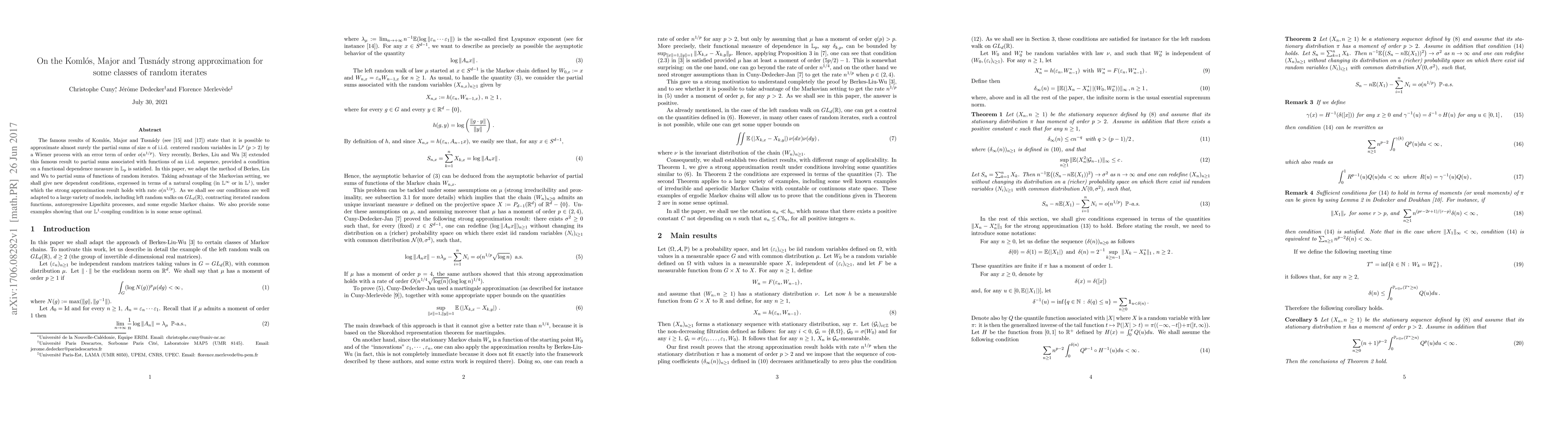 The famous results of Koml\'os, Major and Tusn\'ady (see [15] and [17]) state that it is possible to approximate almost surely the partial sums of size n of i.i.d. centered random variables in L p (p > 2) by a Wiener process with an error term of order o(n 1/p). Very recently, Berkes, Liu and Wu [3] extended this famous result to partial sums associated with functions of an i.i.d. sequence, provided a condition on a functional dependence measure in L p is satisfied. In this paper, we adapt the method of Berkes, Liu and Wu to partial sums of functions of random iterates. Taking advantage of the Markovian setting, we shall give new dependent conditions, expressed in terms of a natural coupling (in L $\infty$ or in L 1), under which the strong approximation result holds with rate o(n 1/p). As we shall see our conditions are well adapted to a large variety of models, including left random walks on GL d (R), contracting iterated random functions, autoregressive Lipschitz processes, and some ergodic Markov chains. We also provide some examples showing that our L 1-coupling condition is in some sense optimal.
