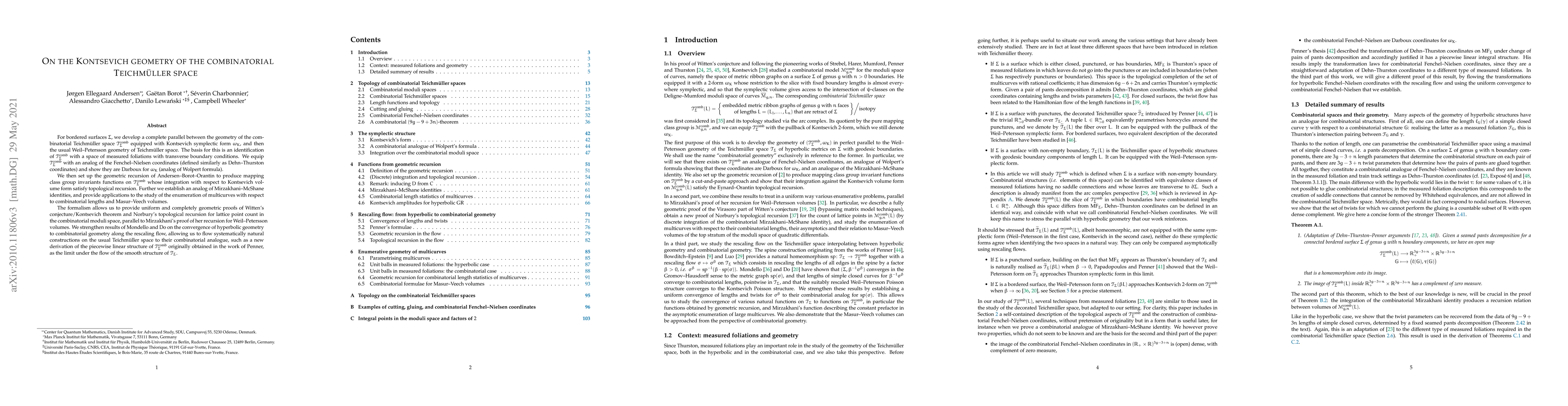 For bordered surfaces S, we develop a complete parallel between the geometry of the combinatorial Teichm\"uller space $T_S^{comb}$ equipped with Kontsevich symplectic form $\omega_K$, and then the usual Weil-Petersson geometry of Teichm\"uller space $T_S$. The basis for this is an identification of $T_S^{comb}$ with a space of measured foliations with transverse boundary conditions. We equip $T_S^{comb}$ with an analog of the Fenchel-Nielsen coordinates (defined similarly as Dehn-Thurston coordinates) and show they are Darboux for $\omega_K$ (analog of Wolpert formula). We then set up the geometric recursion of Andersen-Borot-Orantin to produce mapping class group invariants functions on $T_S^{comb}$ whose integration with respect to Kontsevich volume form satisfy topological recursion. Further we establish an analog of Mirzakhani-McShane identities, and provide applications to the study of the enumeration of multicurves with respect to combinatorial lengths and Masur-Veech volumes. The formalism allows us to provide uniform and completely geometric proofs of Witten's conjecture/Kontsevich theorem and Norbury's topological recursion for lattice point count in the combinatorial moduli space, parallel to Mirzakhani's proof of her recursion for Weil-Petersson volumes. We strengthen results of Mondello and Do on the convergence of hyperbolic geometry to combinatorial geometry along the rescaling flow, allowing us to flow systematically natural constructions on the usual Teichm\"uller space to their combinatorial analogue, such as a new derivation of the piecewise linear structure of $T_S^{comb}$ originally obtained in the work of Penner, as the limit under the flow of the smooth structure of $T_S$.