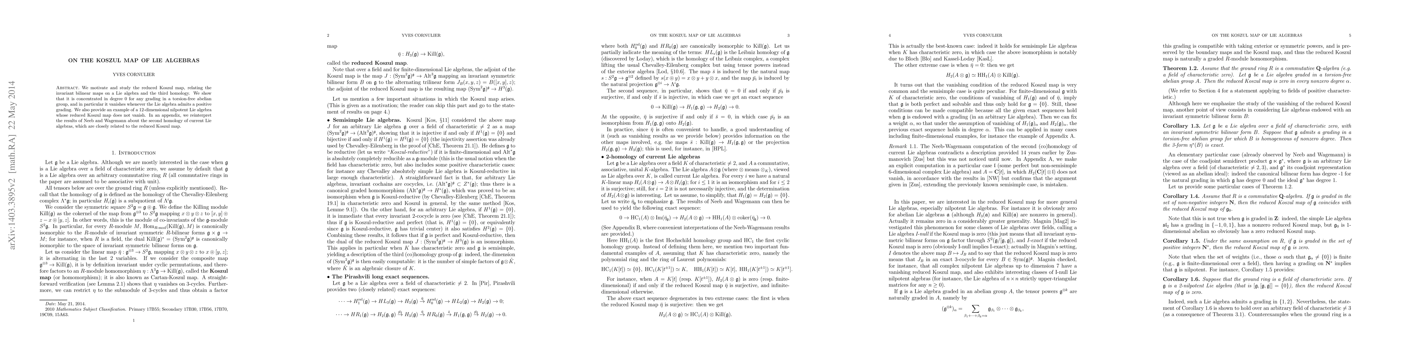 The paper investigates the reduced Koszul map, demonstrating it is degree 0 concentrated for torsion-free abelian gradings and vanishes under positive gradings, while presenting a counterexample in nilpotent Lie algebras. An appendix reinterprets results concerning current Lie algebras' second homology.