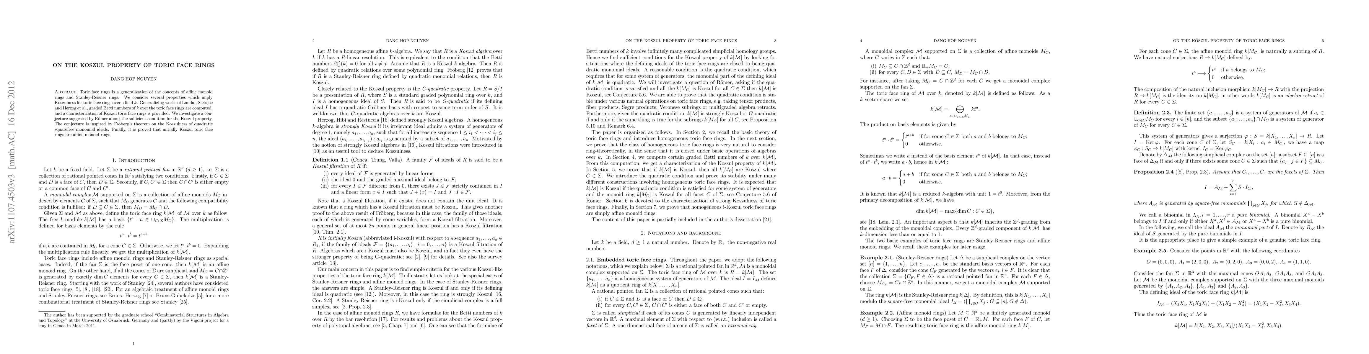 This paper generalizes the concept of Koszulness for toric face rings, extending previous works and computing graded Betti numbers to characterize Koszul toric face rings. It also proves Römer's conjecture on sufficient conditions for the Koszul property and establishes that initially Koszul toric face rings are affine monoid rings.