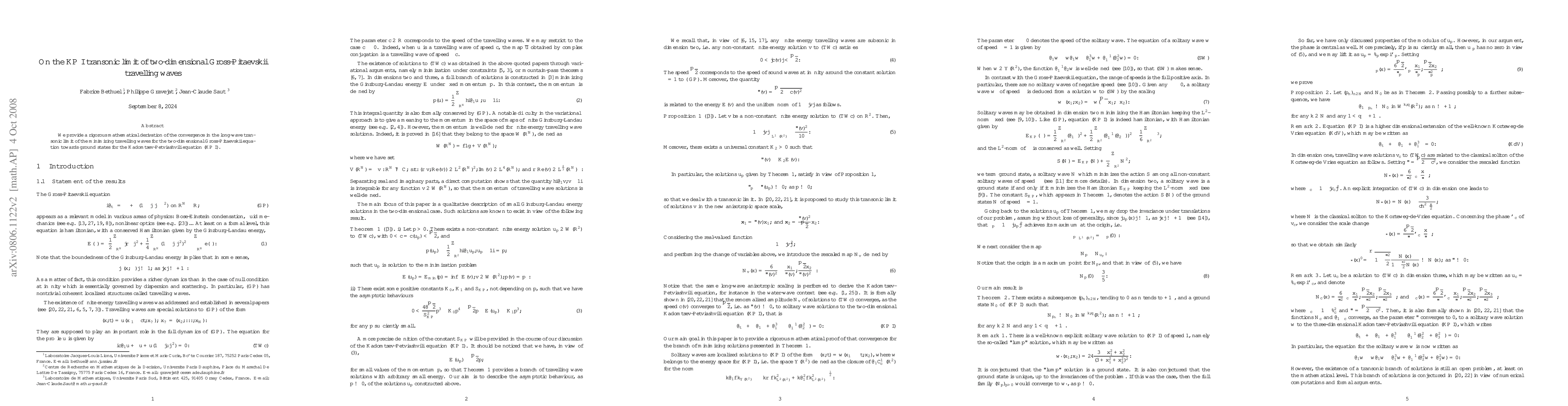 This paper rigorously derives the convergence of two-dimensional Gross-Pitaevskii equation's minimizing travelling waves towards ground states of the Kadomtsev-Petviashvili I equation in the long-wave transonic limit.