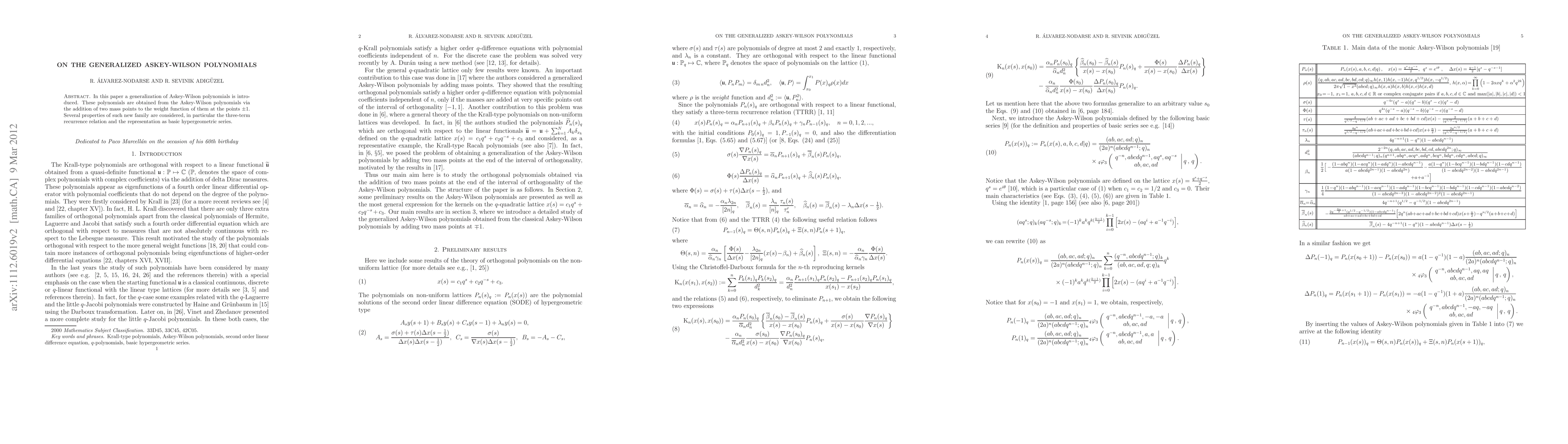 The Krall-type Askey-Wilson polynomials are introduced as a new family of polynomials derived from the Askey-Wilson polynomials with two added mass points at $ heta = rac{1}{2}$ and $-rac{1}{2}$. The paper explores their properties, including a three-term recurrence relation and representation as basic hypergeometric series.