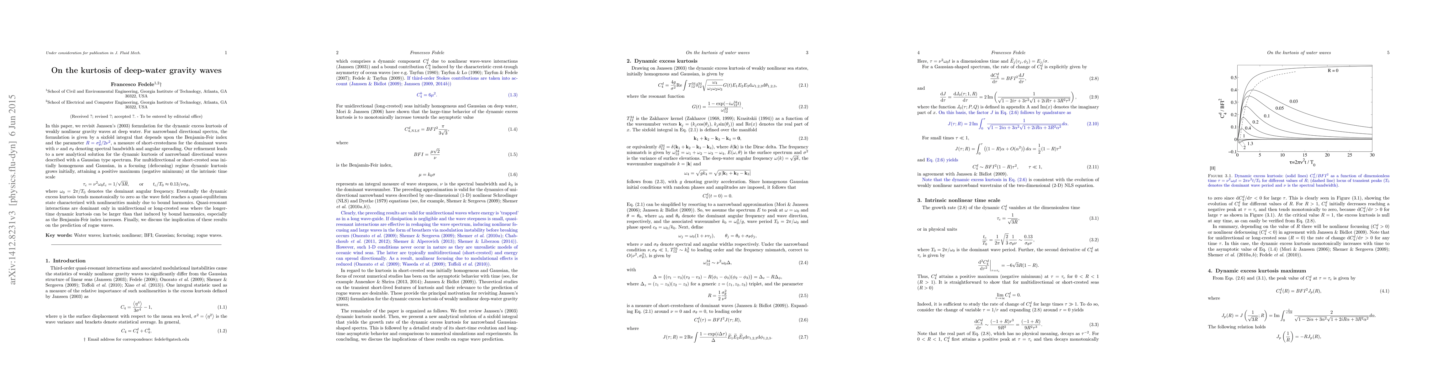 Researchers refined a 2003 formulation for deep-water gravity waves' kurtosis, finding it grows initially in focusing seas but tends to zero as the wave field reaches equilibrium, with implications for predicting rogue waves.