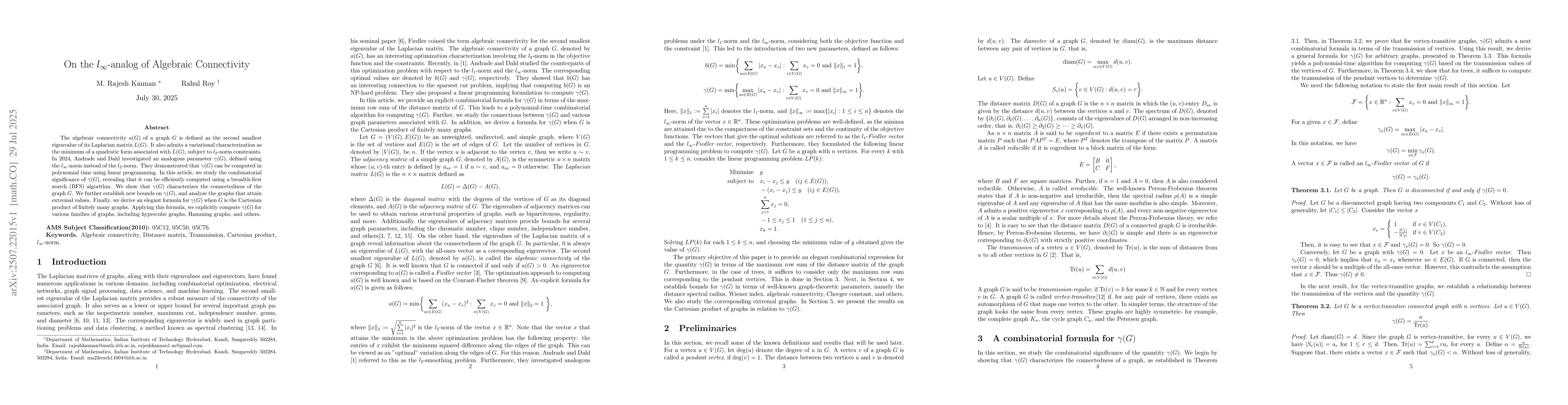 The research investigates the parameter γ(G) as an l∞-analogue of the classical algebraic connectivity, demonstrating its characterization of graph connectedness through a combinatorial formula based on the maximum row sum of the distance matrix, efficiently computable via breadth-first search.