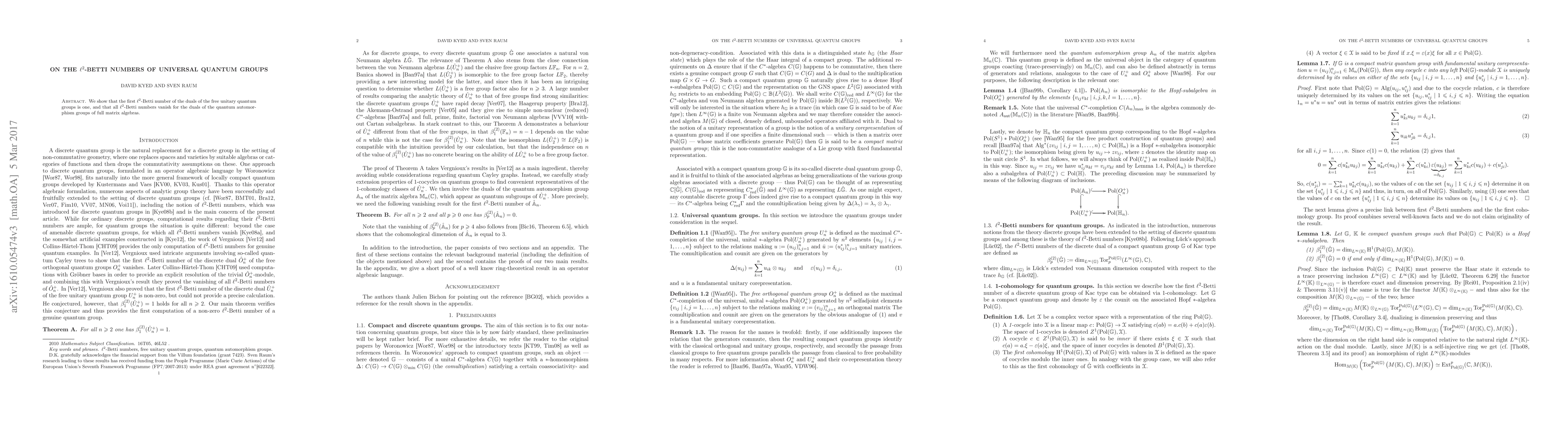 The research establishes that the first $\ell^2$-Betti number of duals of free unitary quantum groups is one, while all higher $\ell^2$-Betti numbers vanish for duals of quantum automorphism groups of full matrix algebras.