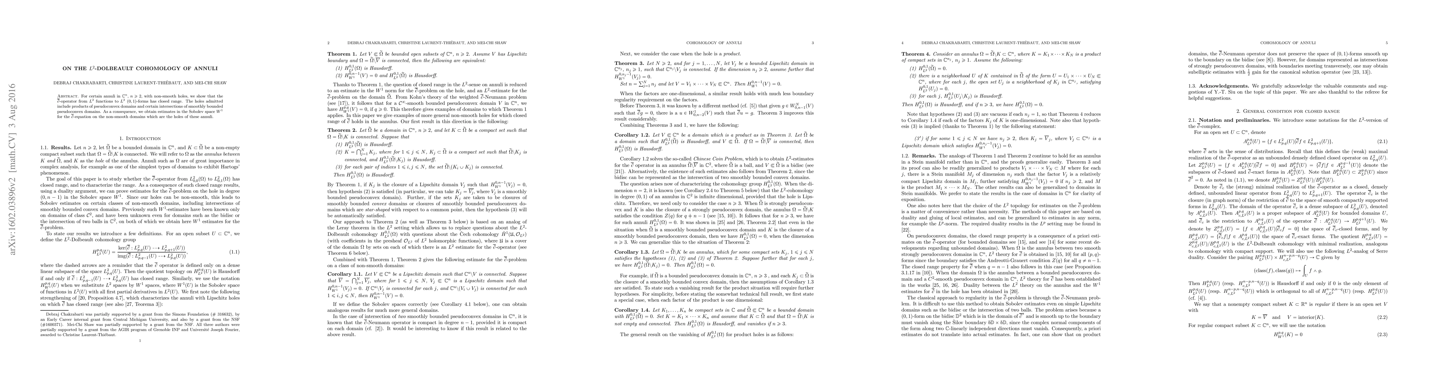 For certain annuli in $\mathbb{C}^n$, $n\geq 2$, with non-smooth holes, we show that the $\bar{\partial}$-operator from $L^2$ functions to $L^2$ $(0,1)$-forms has closed range. The holes admitted include products of pseudoconvex domains and certain intersections of smoothly bounded pseudoconvex domains. As a consequence, we obtain estimates in the Sobolev space $W^1$ for the $\bar{\partial}$-equation on the non-smooth domains which are the holes of these annuli.