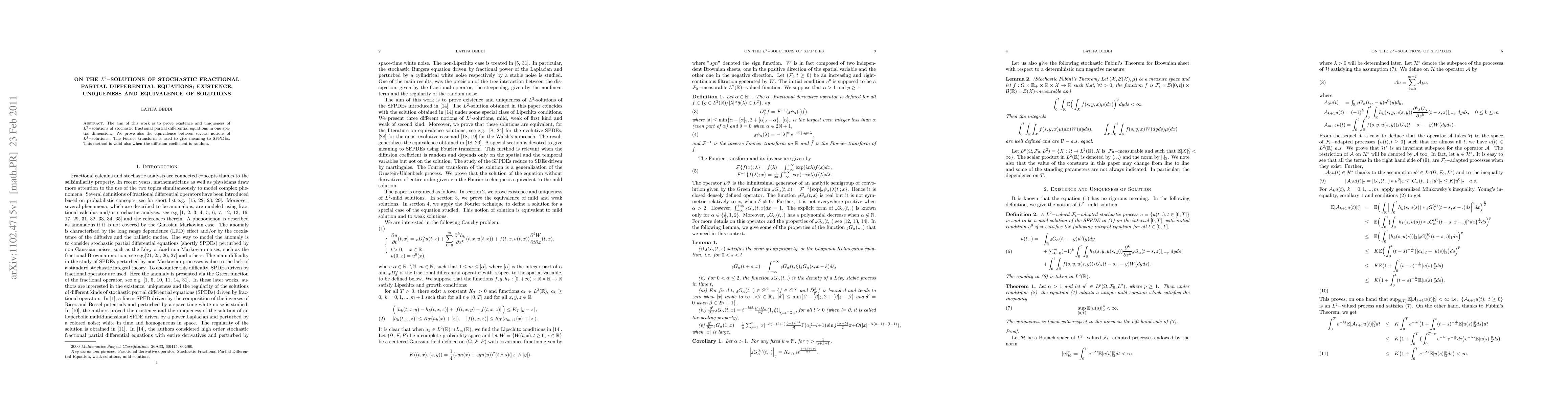 The aim of this work is to prove existence and uniqueness of $L^{2}-$solutions of stochastic fractional partial differential equations in one spatial dimension. We prove also the equivalence between several notions of $L^{2}-$solutions. The Fourier transform is used to give meaning to SFPDEs. This method is valid also when the diffusion coefficient is random.