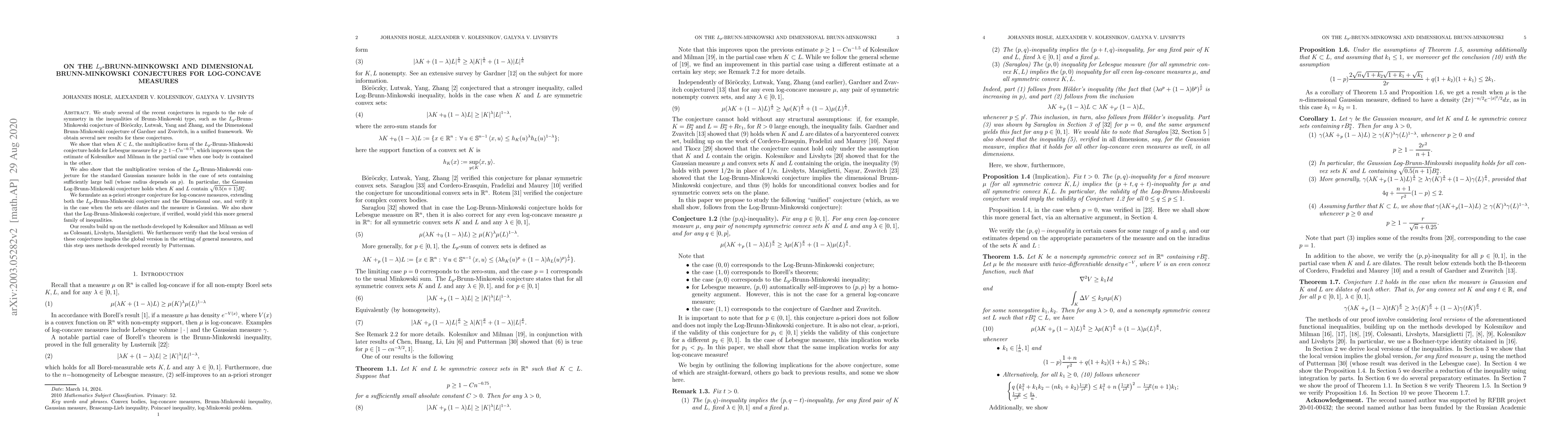 This paper investigates conjectures related to the Brunn-Minkowski inequality for log-concave measures, demonstrating improved results for the $L_p$-Brunn-Minkowski conjecture when one convex body is contained within another. It also verifies a broader conjecture for Gaussian measures and log-concave measures, leveraging methods from previous works and showing that local versions imply global versions.