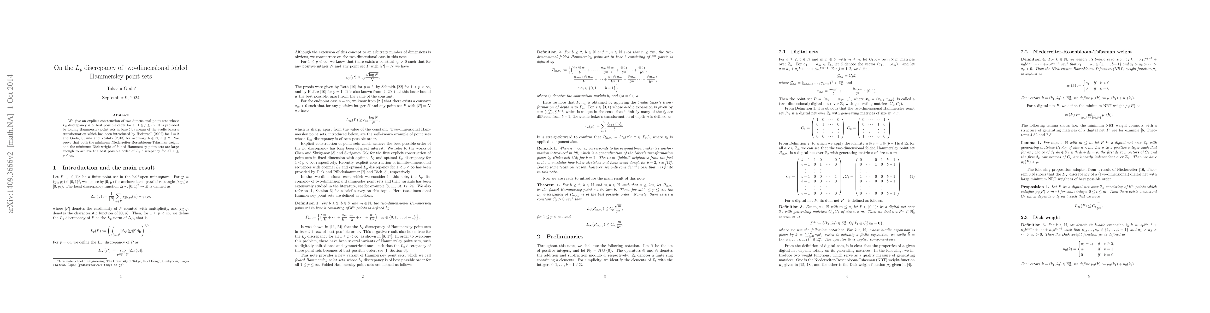 This paper constructs two-dimensional point sets using a folded Hammersley approach via the $b$-adic baker's transformation, achieving optimal $L_p$ discrepancy for all $1\le p\le \infty$. The method ensures the minimum Niederreiter-Rosenbloom-Tsfasman weight and Dick weight are sufficiently large.