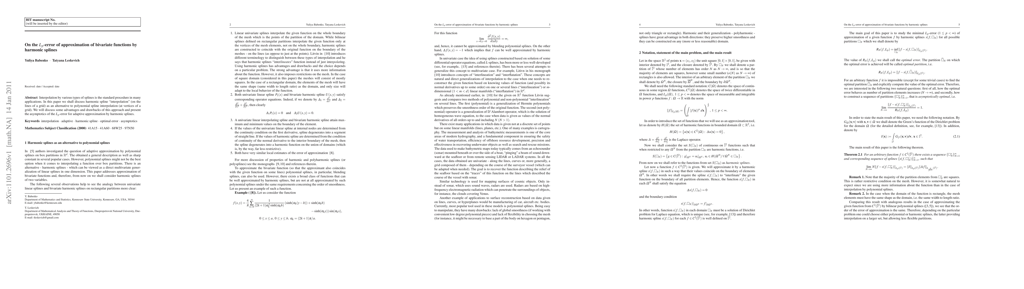 This paper explores the use of harmonic splines for bivariate function interpolation, comparing it to polynomial spline interpolation. It presents the asymptotic behavior of the $L_p$-error for adaptive approximation using harmonic splines, highlighting both its advantages and potential drawbacks.