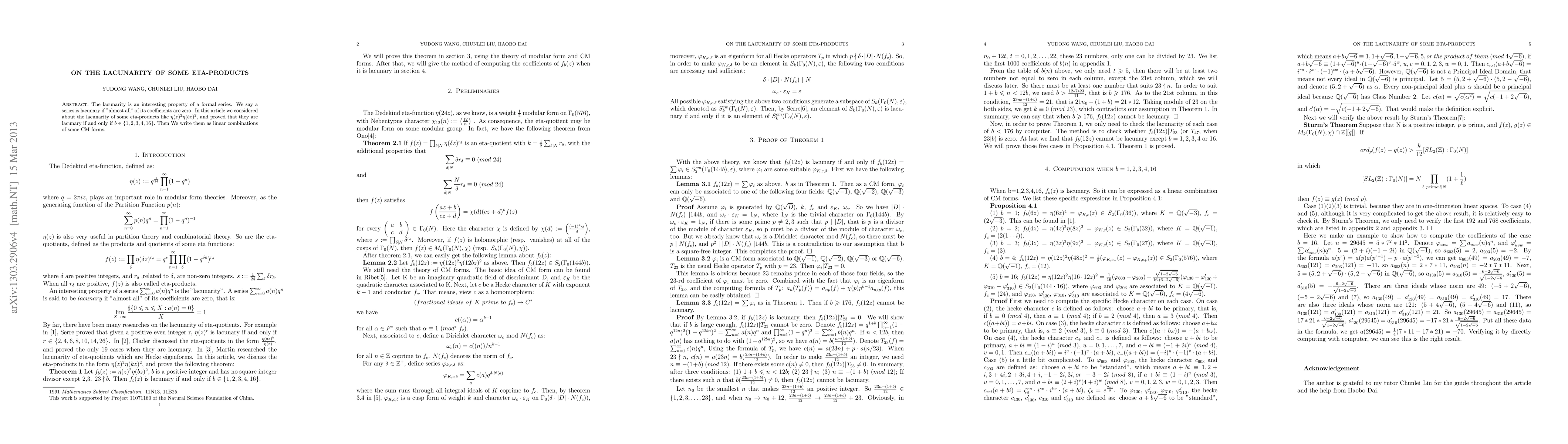 The lacunarity is an interesting property of a formal series. We say a series is lacunary if "almost all" of its coefficients are zero. In this article we considered about the lacunarity of some eta-products like \eta(z)^2\eta(bz)^2, and proved that they are lacunary if and only if b is 1,2,3,4 or 16. Then We write them as linear combinations of some CM forms.