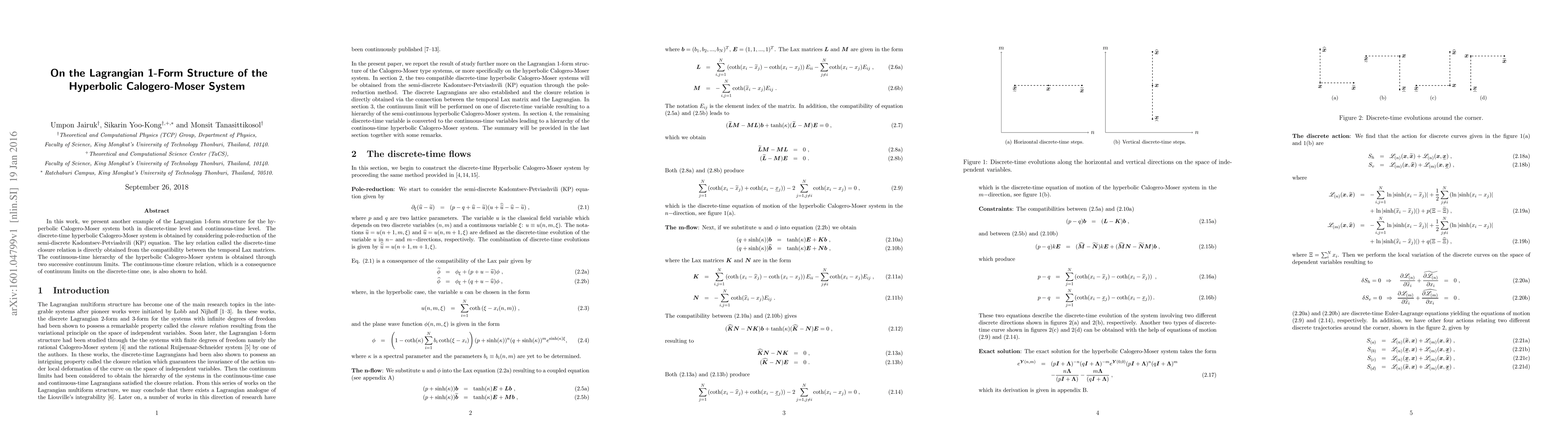 This paper explores the Lagrangian 1-form structure of the hyperbolic Calogero-Moser system, presenting it in both discrete and continuous time. The discrete version is derived from the pole-reduction of the semi-discrete KP equation, while the continuous version is obtained through two successive continuum limits.