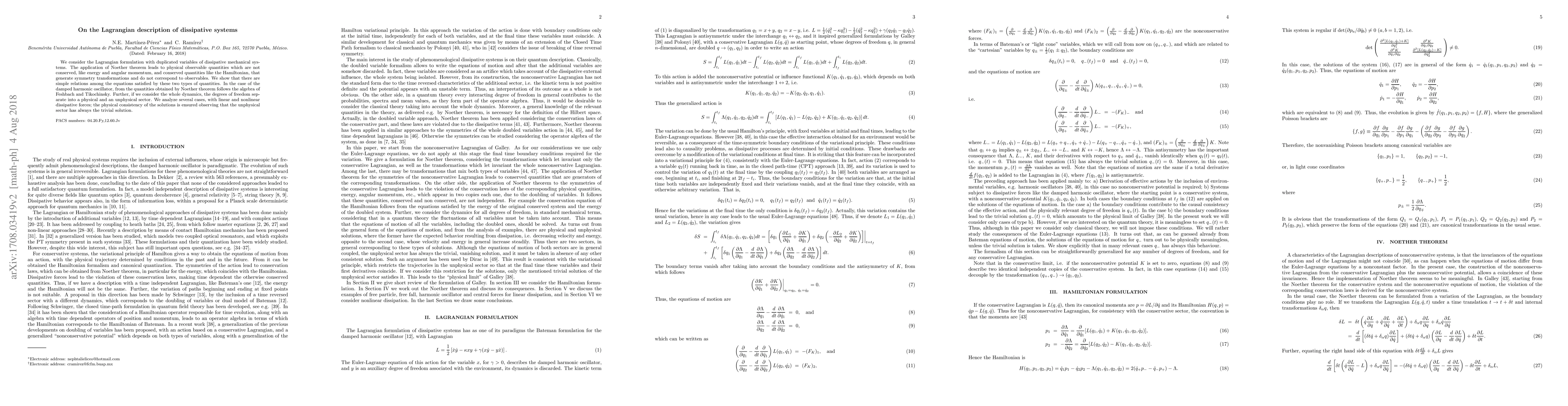 We consider the Lagrangian formulation with duplicated variables of dissipative mechanical systems. The application of Noether theorem leads to physical observable quantities which are not conserved, like energy and angular momentum, and conserved quantities like the Hamiltonian, that generate symmetry transformations and do not correspond to observables. We show that there are simple relations among the equations satisfied by these two types of quantities. In the case of the damped harmonic oscillator, from the quantities obtained by Noether theorem follows the algebra of Feshbach and Tikochinsky. Further, if we consider the whole dynamics, the degrees of freedom separate into a physical and an unphysical sector. We analyze several cases, with linear and nonlinear dissipative forces; the physical consistency of the solutions is ensured observing that the unphysical sector has always the trivial solution.
