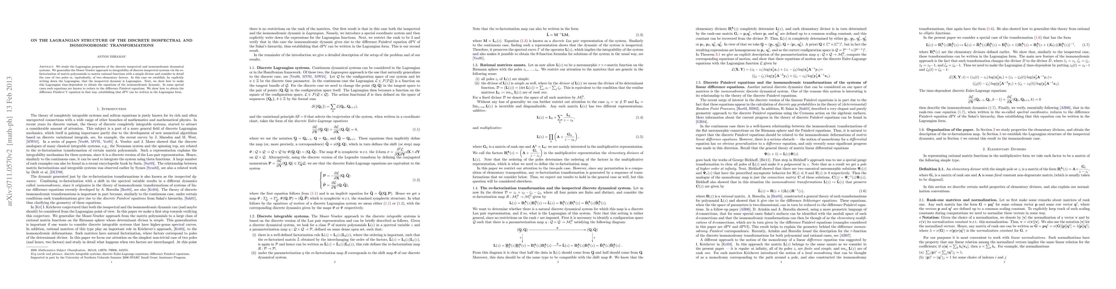 We establish the Lagrangian nature of the discrete isospectral and isomonodromic dynamical systems corresponding to the re-factorization transformations of the rational matrix functions on the Riemann sphere. Specifically, in the isospectral case we generalize the Moser-Veselov approach to integrability of discrete systems via the re-factorization of matrix polynomials to a more general class of matrix rational functions that have a simple divisor and, in the quadratic case, explicitly write the Lagrangian function for such systems. Next we show that if we let certain parameters in this Lagrangian to be time-dependent, the resulting Euler-Lagrange equations describe the isomonodromic transformations of systems of linear difference equations. It is known that in some special cases such equations reduce to the difference Painlev\'e equation. As an example, we show how to obtain the difference Painlev\`e V equation in this way, and hence we establish that this equation can be written in the Lagrangian form.
