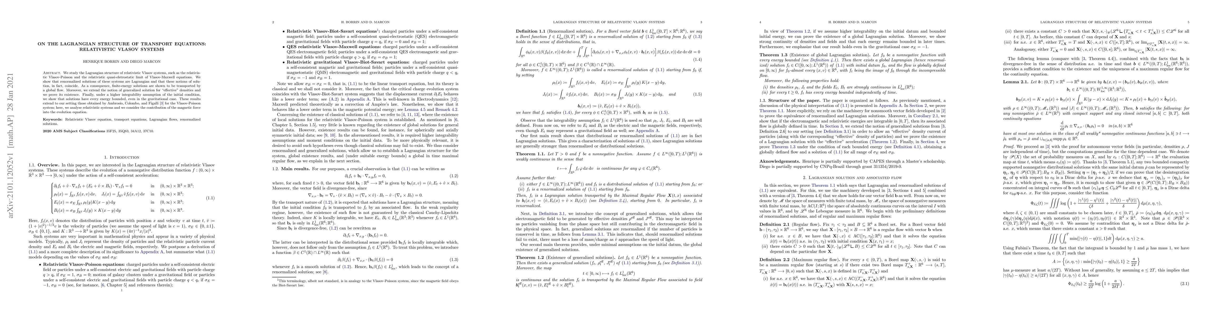 This paper explores the Lagrangian structure of relativistic Vlasov systems, demonstrating that renormalized solutions coincide with Lagrangian solutions and are transported by a global flow. It also extends the notion of generalized solutions for effective densities and proves their existence under certain conditions.