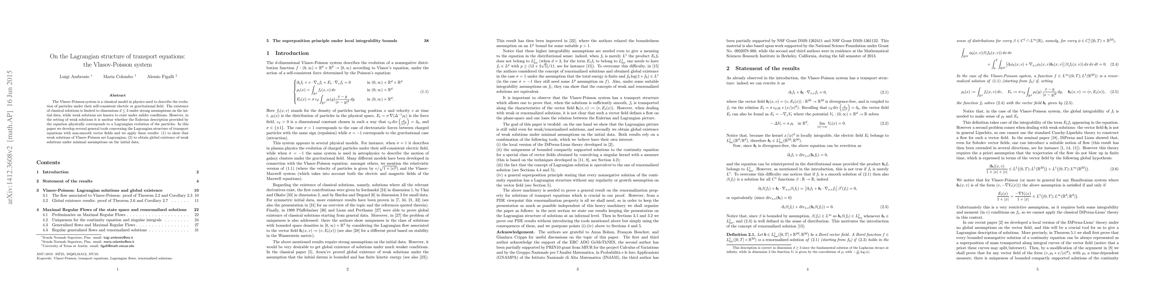 This paper develops tools to understand the Lagrangian structure of transport equations, specifically applying them to the Vlasov-Poisson system. It demonstrates that weak solutions of the Vlasov-Poisson system correspond to a Lagrangian evolution and establishes global existence of these weak solutions under minimal initial conditions.