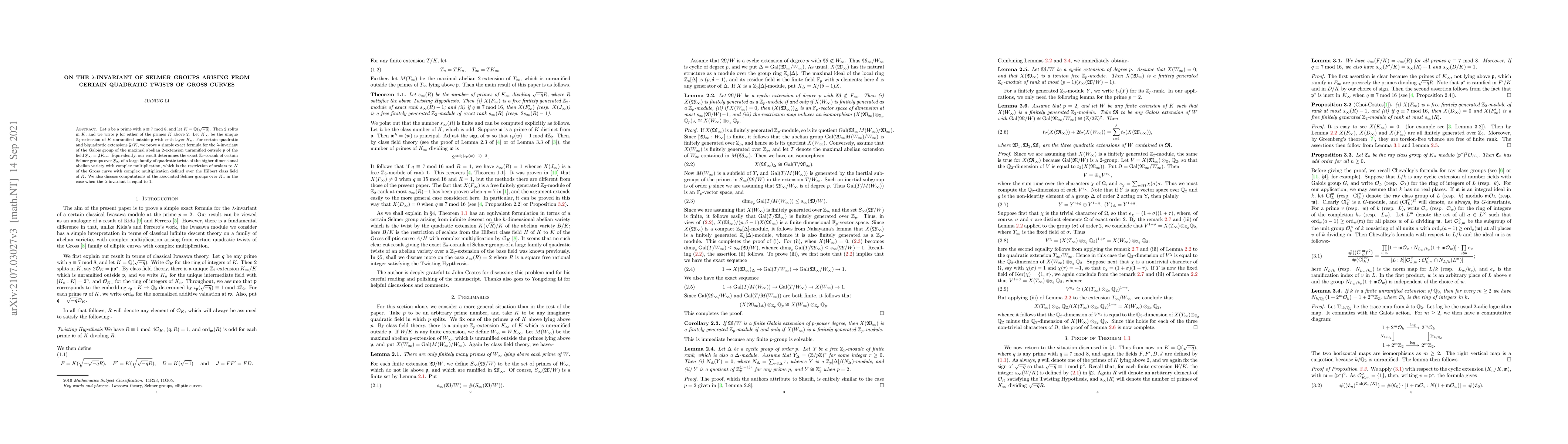 Let $q$ be a prime with $q \equiv 7 \mod 8$, and let $K=\mathbb{Q}(\sqrt{-q})$. Then $2$ splits in $K$, and we write $\mathfrak{p}$ for either of the primes $K$ above $2$. Let $K_\infty$ be the unique $\mathbb{Z}_2$-extension of $K$ unramified outside $\mathfrak{p}$ with $n$-th layer $K_n$. For certain quadratic extensions $F/K$, we prove a simple exact formula for the $\lambda$-invariant of the Galois group of the maximal abelian 2-extension unramified outside $\mathfrak{p}$ of the field $F_\infty = FK_\infty$. Equivalently, our result determines the exact $\mathbb{Z}_2$-corank of certain Selmer groups over $F_\infty$ of a large family of quadratic twists of the higher dimensional abelian variety with complex multiplication, which is the restriction of scalars to $K$ of the Gross curve with complex multiplication defined over the Hilbert class field of $K$. We also discuss computations of the associated Selmer groups over $K_n$ in the case when the $\lambda$-invariant is equal to $1$.