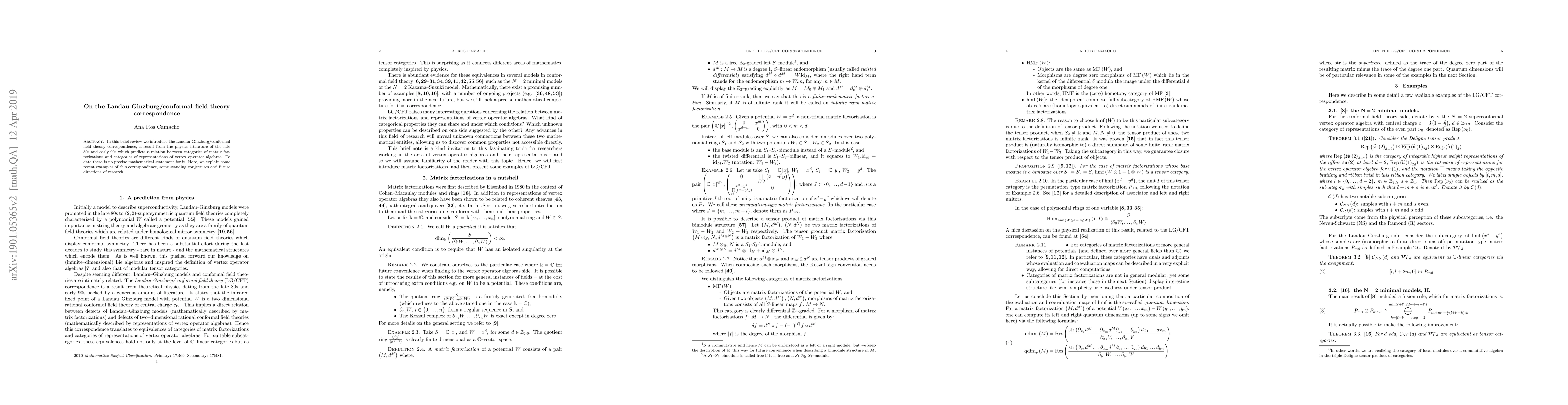 This paper reviews the Landau-Ginzburg/conformal field theory correspondence, highlighting its relation between matrix factorizations and vertex operator algebra representations, and discusses recent examples, conjectures, and future research directions. Despite its significance, a precise mathematical formulation remains elusive.