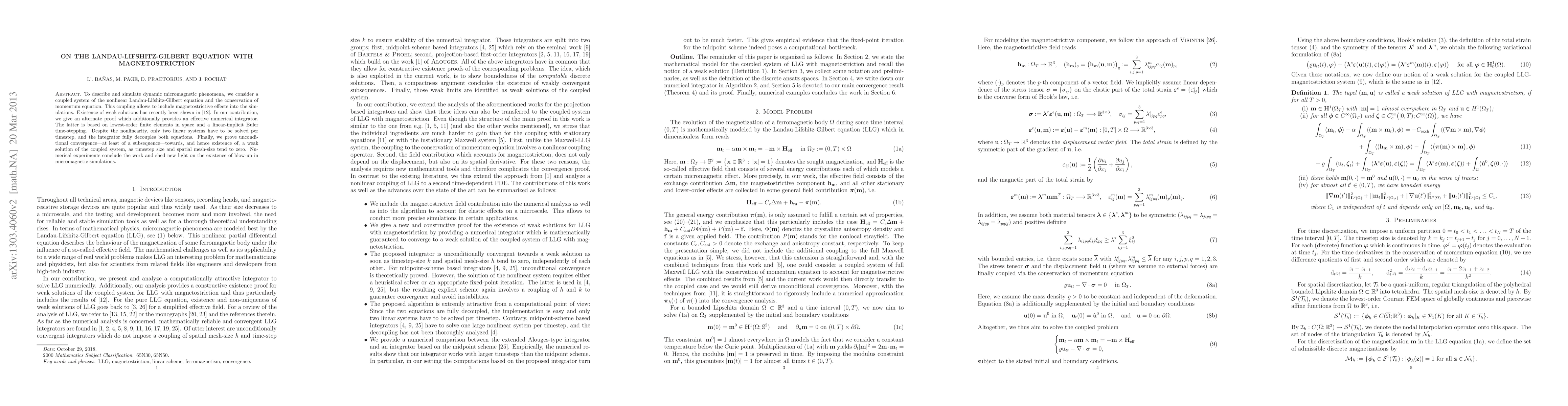 To describe and simulate dynamic micromagnetic phenomena, we consider a coupled system of the nonlinear Landau-Lifshitz-Gilbert equation and the conservation of momentum equation. This coupling allows to include magnetostrictive effects into the simulations. Existence of weak solutions has recently been shown in [Carbout et al. 2011]. In our contribution, we give an alternate proof which additionally provides an effective numerical integrator. The latter is based on lowest-order finite elements in space and a linear-implicit Euler time-stepping. Despite the nonlinearity, only two linear systems have to be solved per timestep, and the integrator fully decouples both equations. Finally, we prove unconditional convergence---at least of a subsequence---towards, and hence existence of, a weak solution of the coupled system, as timestep size and spatial mesh-size tend to zero. Numerical experiments conclude the work and shed new light on the existence of blow-up in micromagnetic simulations.
