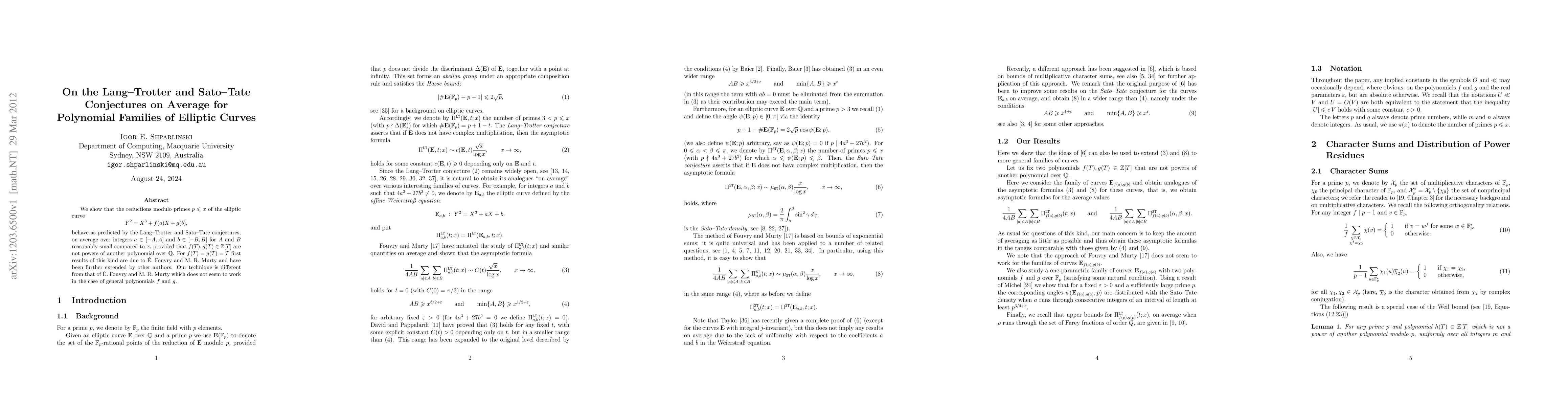 This paper demonstrates that reductions of a specific elliptic curve modulo primes up to $x$ follow the Lang-Trotter and Sato-Tate conjectures on average, for polynomial families with parameters $a$ and $b$ within specified bounds. The authors employ a novel technique distinct from previous methods, applicable to general polynomial forms.