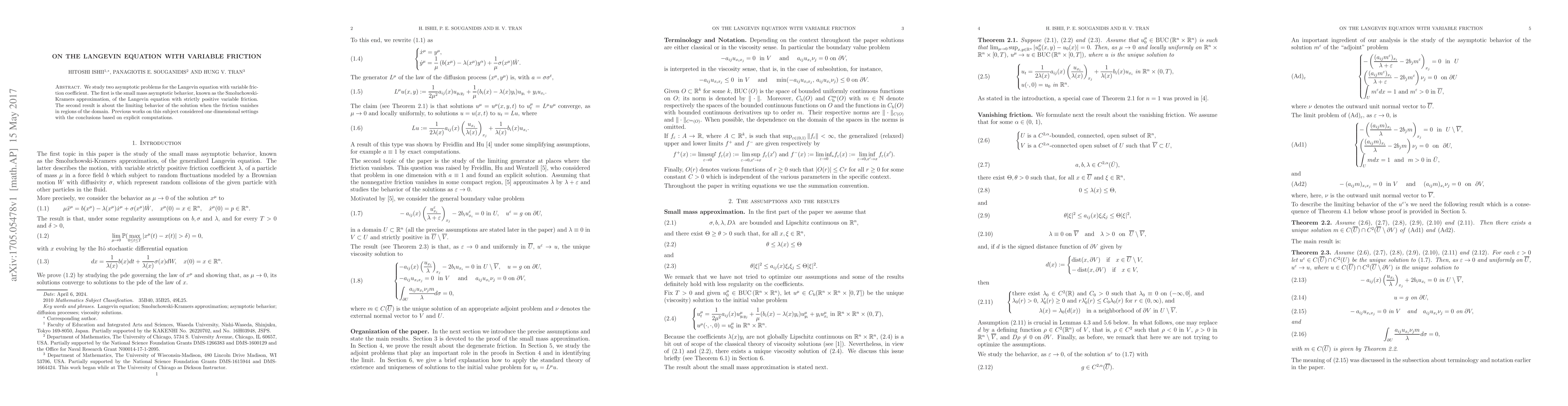 This paper investigates the Langevin equation under variable friction, focusing on two asymptotic behaviors: the small mass limit and the effect of vanishing friction in specific regions. Unlike prior studies, it considers multi-dimensional settings without relying on explicit computations.