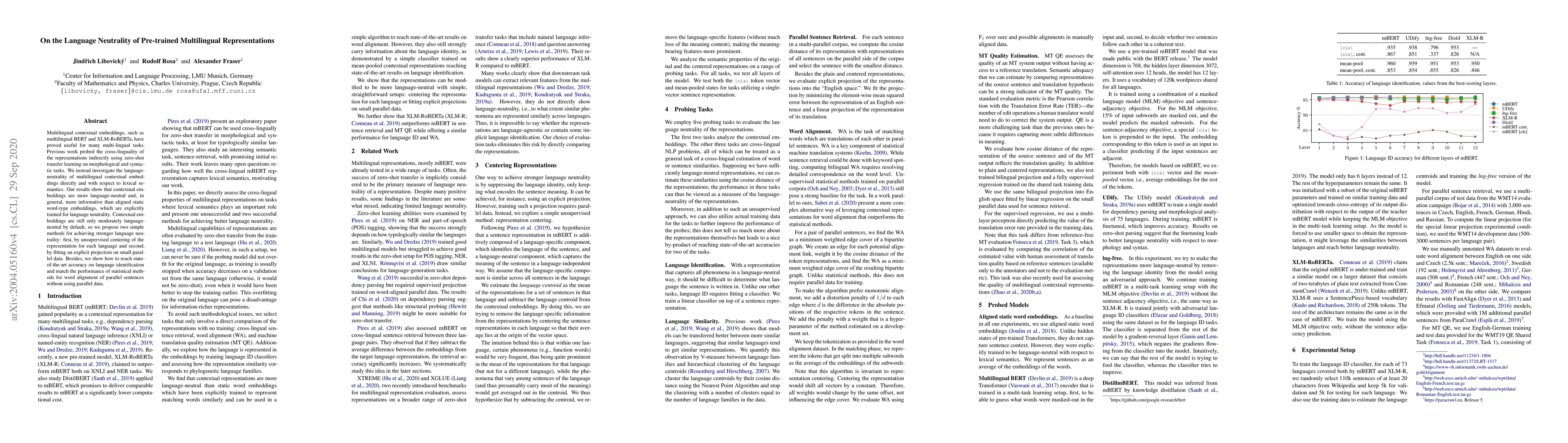 This paper investigates the language neutrality of multilingual contextual embeddings like multilingual BERT, finding they are more neutral and informative than aligned static word-type embeddings. The authors propose two methods to enhance language neutrality and demonstrate state-of-the-art performance on language identification and word alignment tasks without parallel data.
