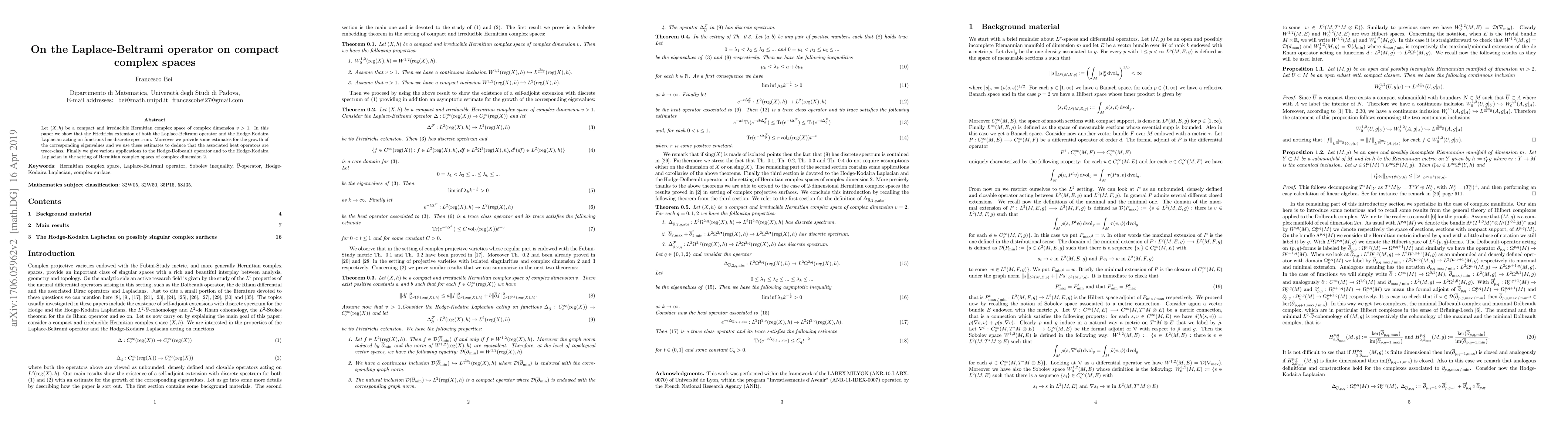 This paper demonstrates that the Friedrichs extension of the Laplace-Beltrami operator and the Hodge-Kodaira Laplacian on compact irreducible Hermitian complex spaces has a discrete spectrum, providing eigenvalue growth estimates and proving the trace-class nature of associated heat operators. Applications are given to the Hodge-Dolbeault operator and the Hodge-Kodaira Laplacian in the context of Hermitian complex spaces of complex dimension 2.
