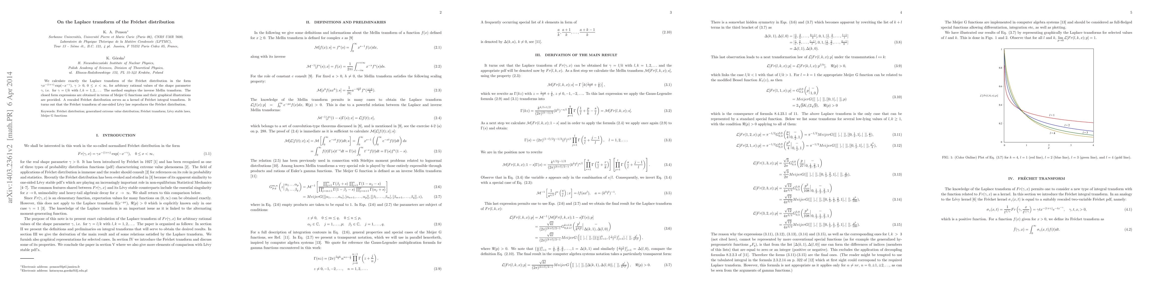 The paper derives the exact Laplace transform of the Fréchet distribution for rational shape parameters using the inverse Mellin transform, expressing it in terms of Meijer G functions and providing graphical illustrations. It also reveals that the Fréchet transform of a one-sided Lévy law reproduces the Fréchet distribution.
