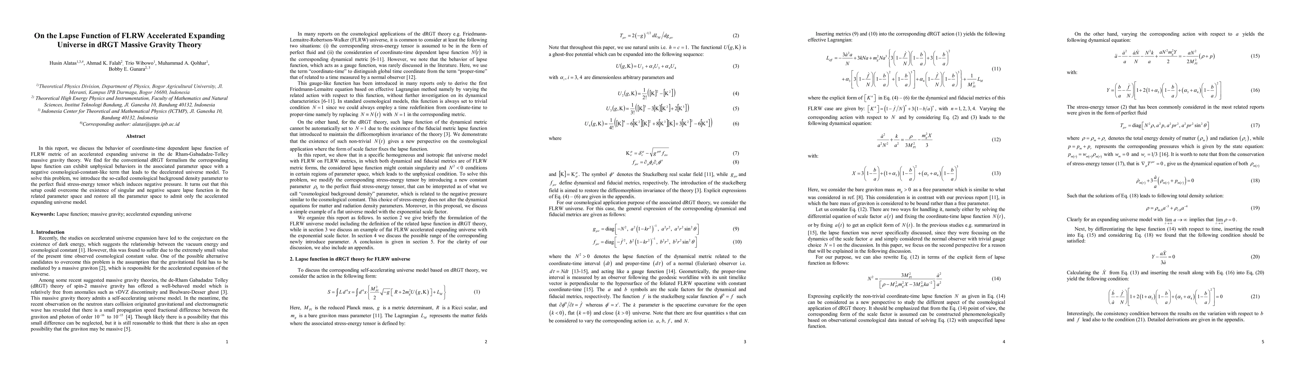 This paper investigates the lapse function in an accelerated expanding universe described by the FLRW metric within the dRGT massive gravity theory, finding unphysical behaviors due to a negative cosmological-constant-like term. To resolve these issues, the authors introduce a cosmological background density parameter, which induces negative pressure and ensures the universe remains in an accelerated expansion model without singularities.
