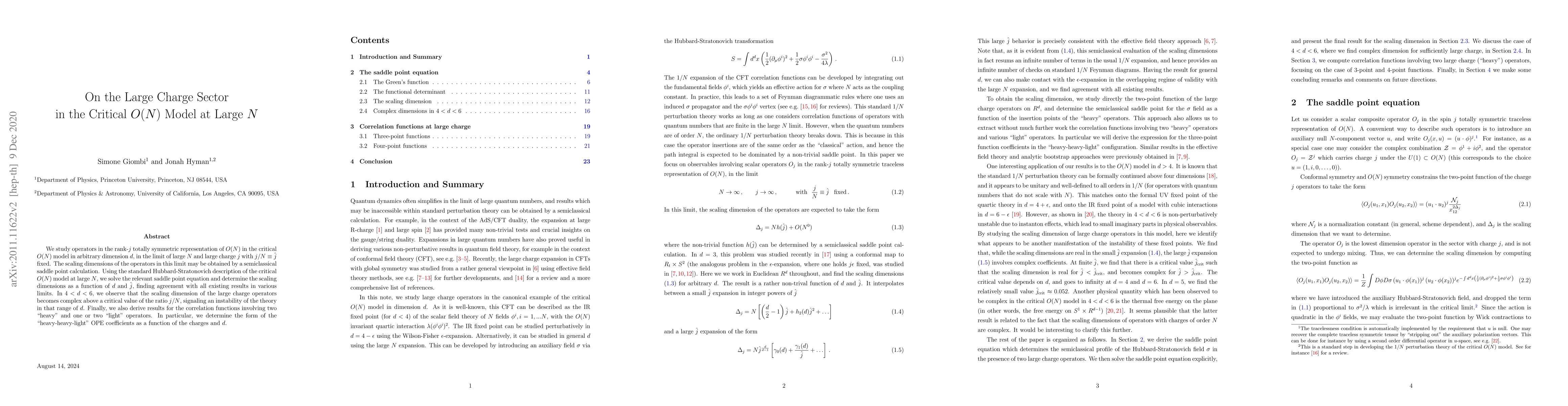 $N$ and large charge $j$ with $j/N\equiv \hat{j}$ fixed. The scaling dimensions