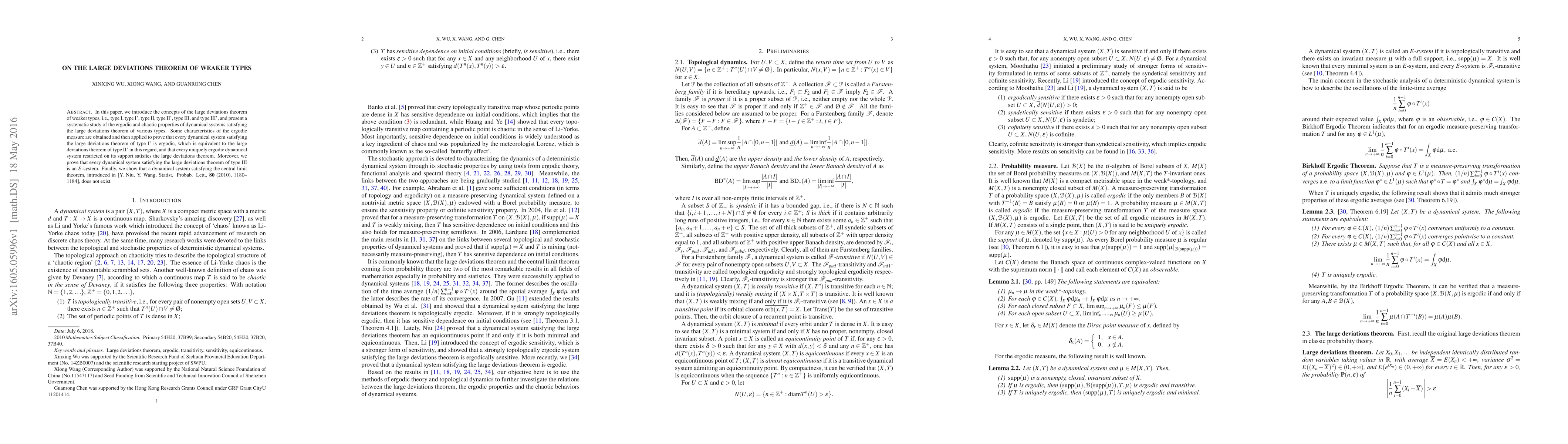 In this paper, we introduce the concepts of the large deviations theorem of weaker types, i.e., type I, type I', type II, type II', type III, and type III', and present a systematic study of the ergodic and chaotic properties of dynamical systems satisfying the large eviations theorem of various types. Some characteristics of the ergodic measure are obtained and then applied to prove that every dynamical system satisfying the large deviations theorem of type I' is ergodic, which is equivalent to the large deviations theorem of type II' in this regard, and that every uniquely ergodic dynamical system restricted on its support satisfies the large deviations theorem. Moreover, we prove that every dynamical system satisfying the large deviations theorem of type III is an $E$-system. Finally, we show that a dynamical system satisfying the central limit theorem, introduced in [Y. Niu, Y. Wang, Statist. Probab. Lett., {\bf 80} (2010), 1180--1184], does not exist.