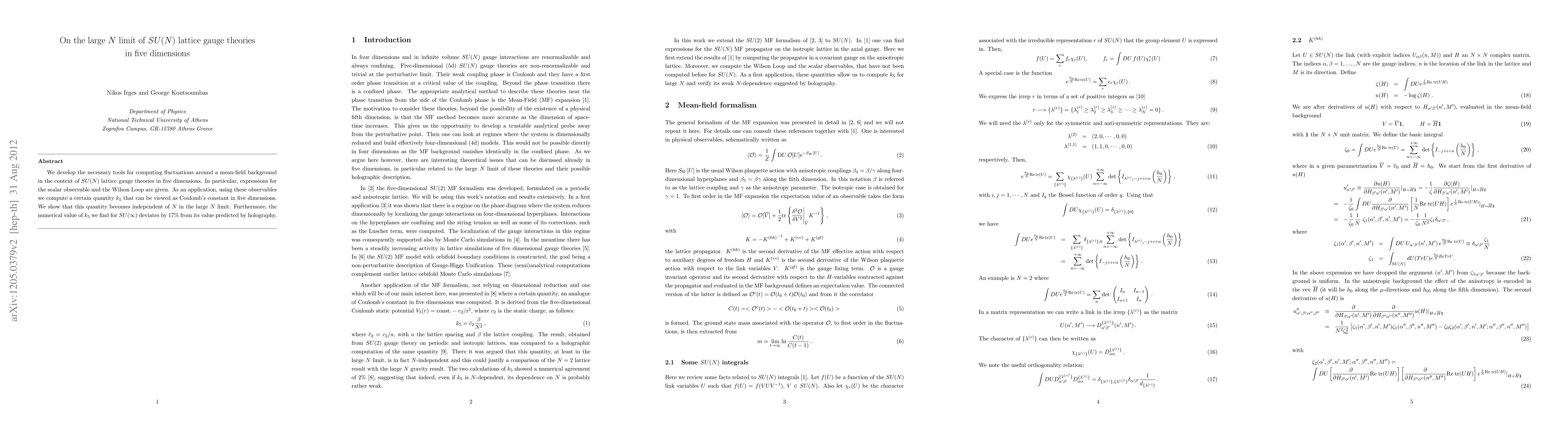 This paper develops tools for analyzing fluctuations in SU(N) lattice gauge theories in five dimensions, deriving expressions for scalar observables and Wilson Loops. It finds that the five-dimensional Coulomb constant k5 becomes N-independent in the large N limit, though its numerical value for SU(infinity) differs by 17% from holographic predictions.