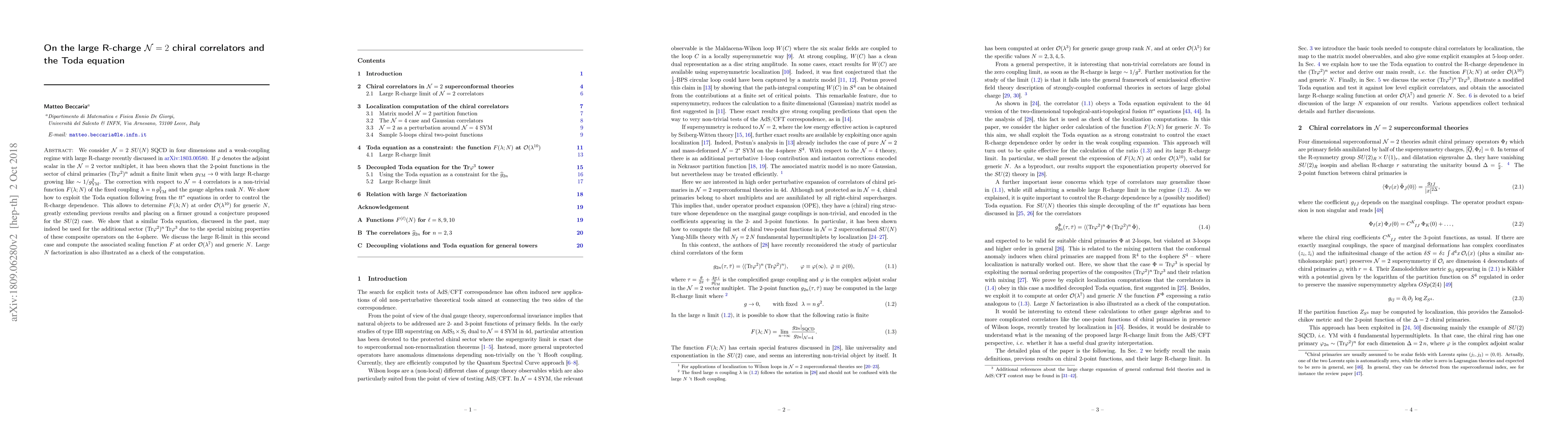 We consider $\mathcal N=2$ $SU(N)$ SQCD in four dimensions and a weak-coupling regime with large R-charge recently discussed in arXiv:1803.00580. If $\varphi$ denotes the adjoint scalar in the $\mathcal N=2$ vector multiplet, it has been shown that the 2-point functions in the sector of chiral primaries $(\text{Tr} \varphi^2)^n$ admit a finite limit when $g_\text{YM}\to 0$ with large R-charge growing like $\sim 1/g^2_\text{YM}$. The correction with respect to $\mathcal N=4$ correlators is a non-trivial function $F(\lambda; N)$ of the fixed coupling $\lambda=n\,g^2_\text{YM}$ and the gauge algebra rank $N$. We show how to exploit the Toda equation following from the $tt^*$ equations in order to control the R-charge dependence. This allows to determine $F(\lambda; N)$ at order $O(\lambda^{10})$ for generic $N$, greatly extending previous results and placing on a firmer ground a conjecture proposed for the $SU(2)$ case. We show that a similar Toda equation, discussed in the past, may indeed be used for the additional sector $(\text{Tr}\varphi^2)^n\,\text{Tr}\varphi^3$ due to the special mixing properties of these composite operators on the 4-sphere. We discuss the large R-limit in this second case and compute the associated scaling function $F$ at order $O(\lambda^7)$ and generic $N$. Large $N$ factorization is also illustrated as a check of the computation.